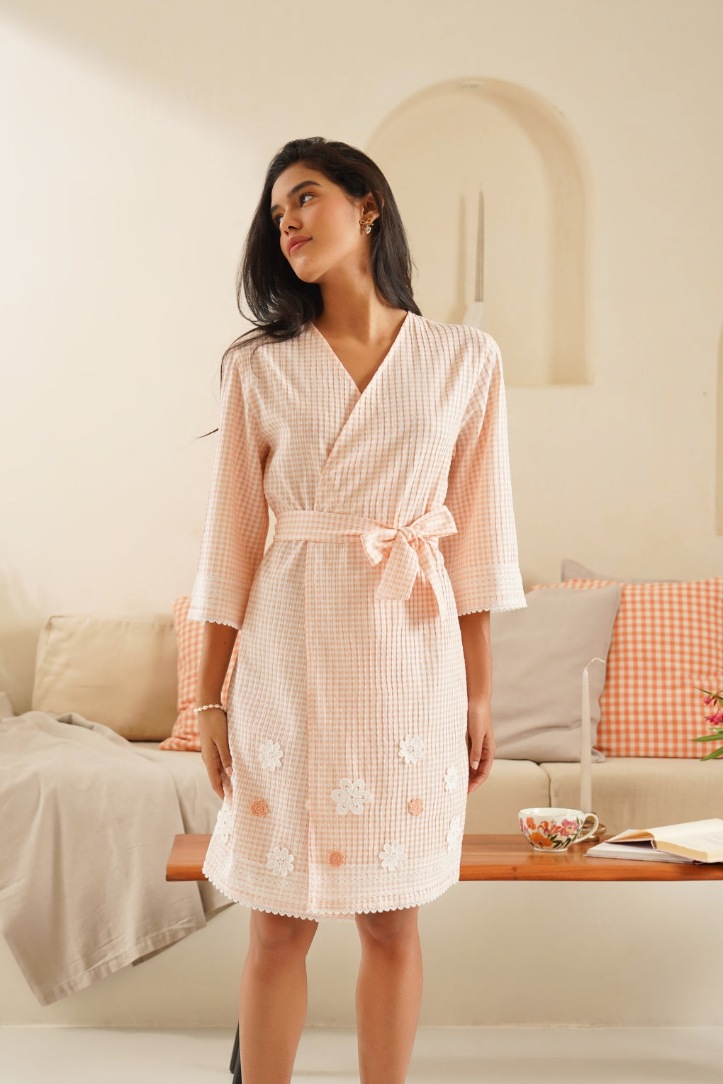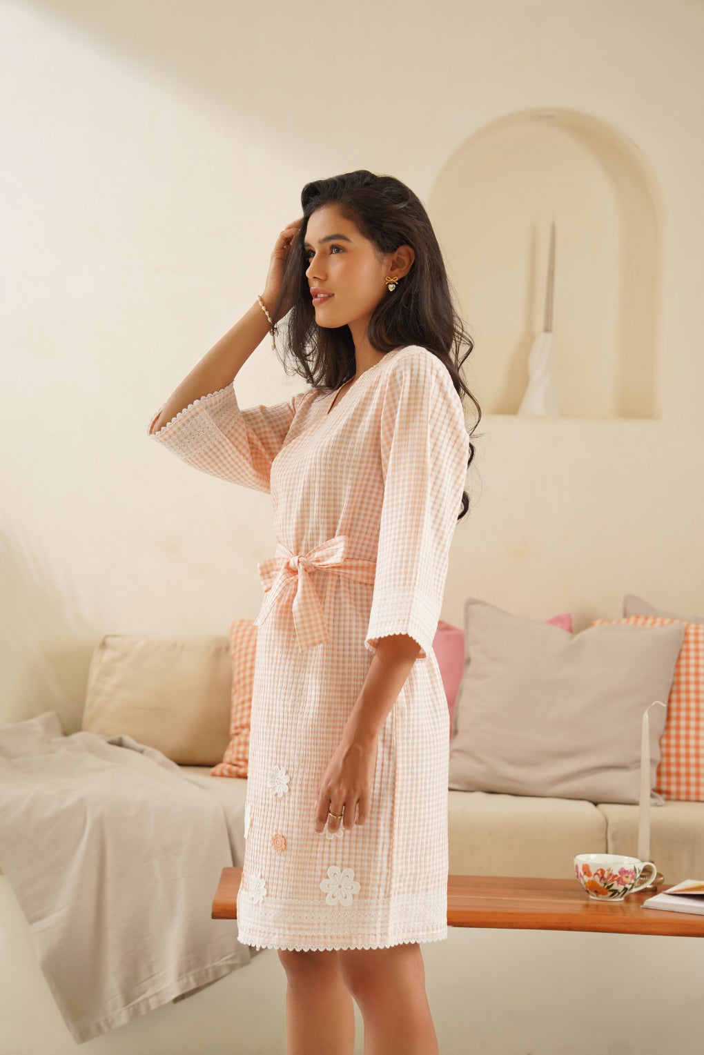 Indulge in the perfect blend of comfort and style with this Blossom Gingham Robe Co-ord Set. Crafted with soft, breathable fabrics, this set features a charming gingham pattern that combines elegance with relaxation. The lounge shorts, designed with a flexible elastic waistband, offer a comfortable and secure fit, while the racerback cami top provides all-night comfort with its sleek V-neckline and minimal straps. Paired with a lightweight wrap robe, adorned with delicate embroidery and scalloped trims, this set is the ultimate choice for unwinding in luxury and embracing restful nights.