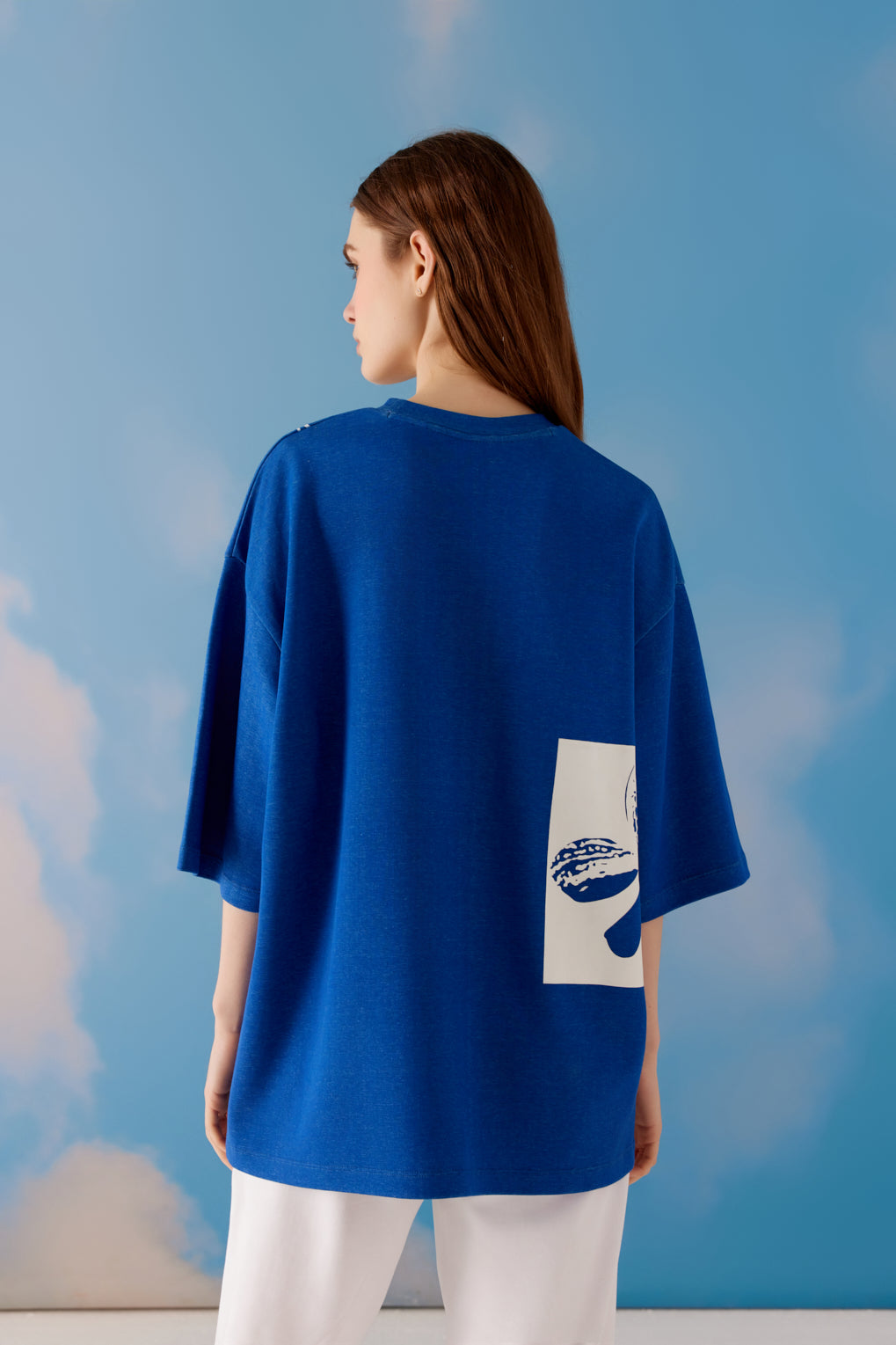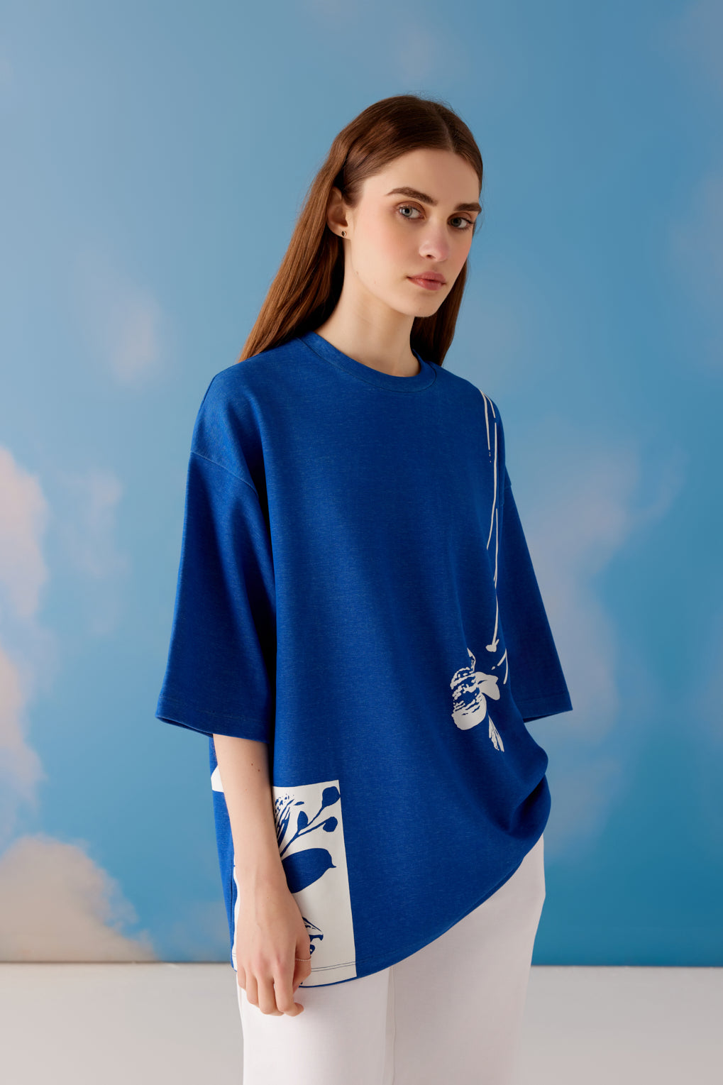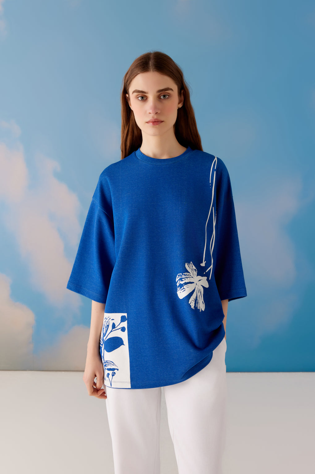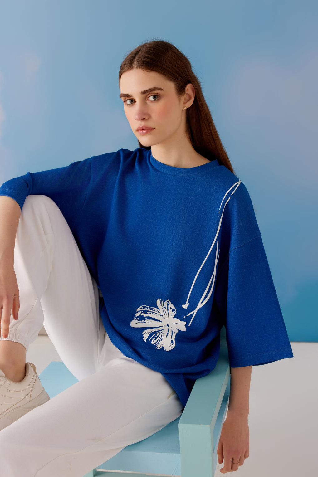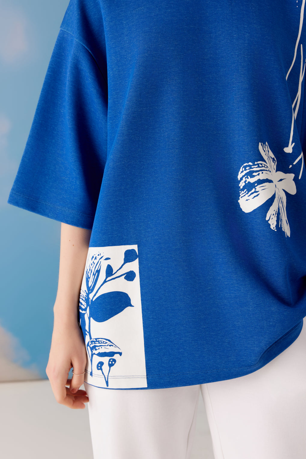 Check out this electric blue tee with a unique placement of floral graphics, crafted from comfortable fabric.