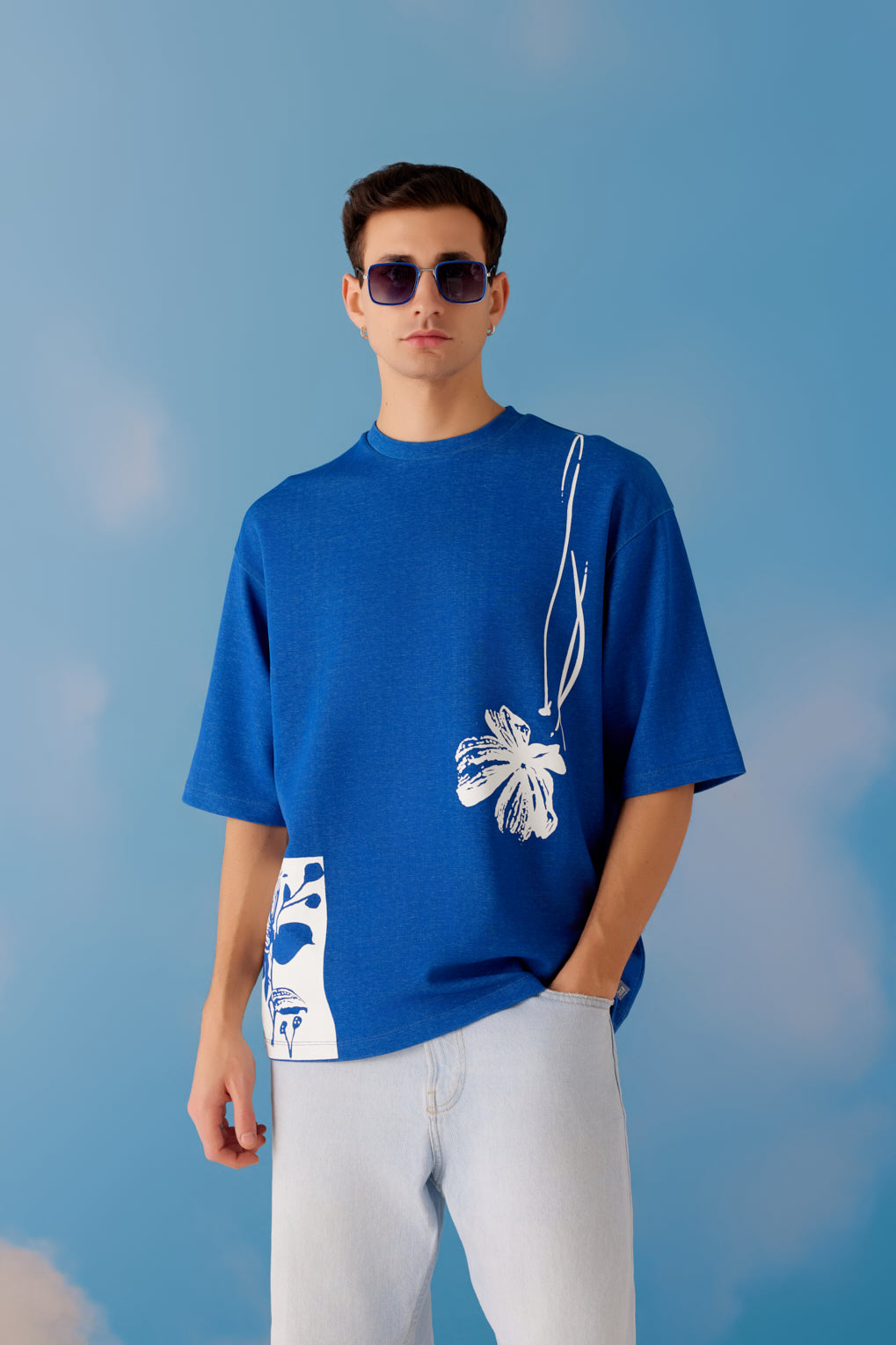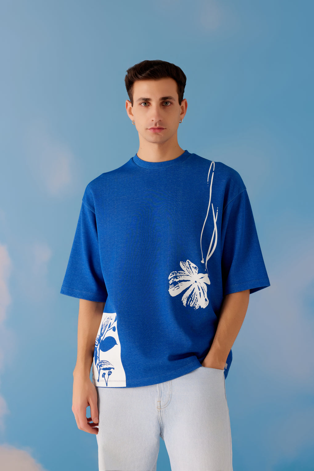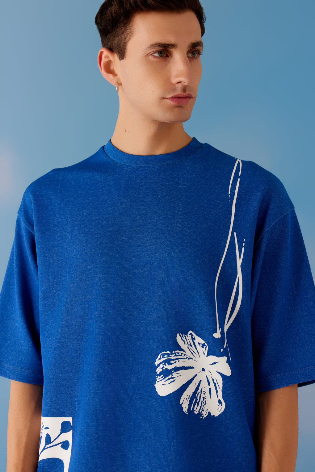Check out this electric blue tee with a unique placement of floral graphics, crafted from comfortable fabric.