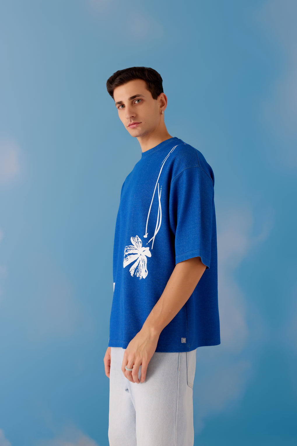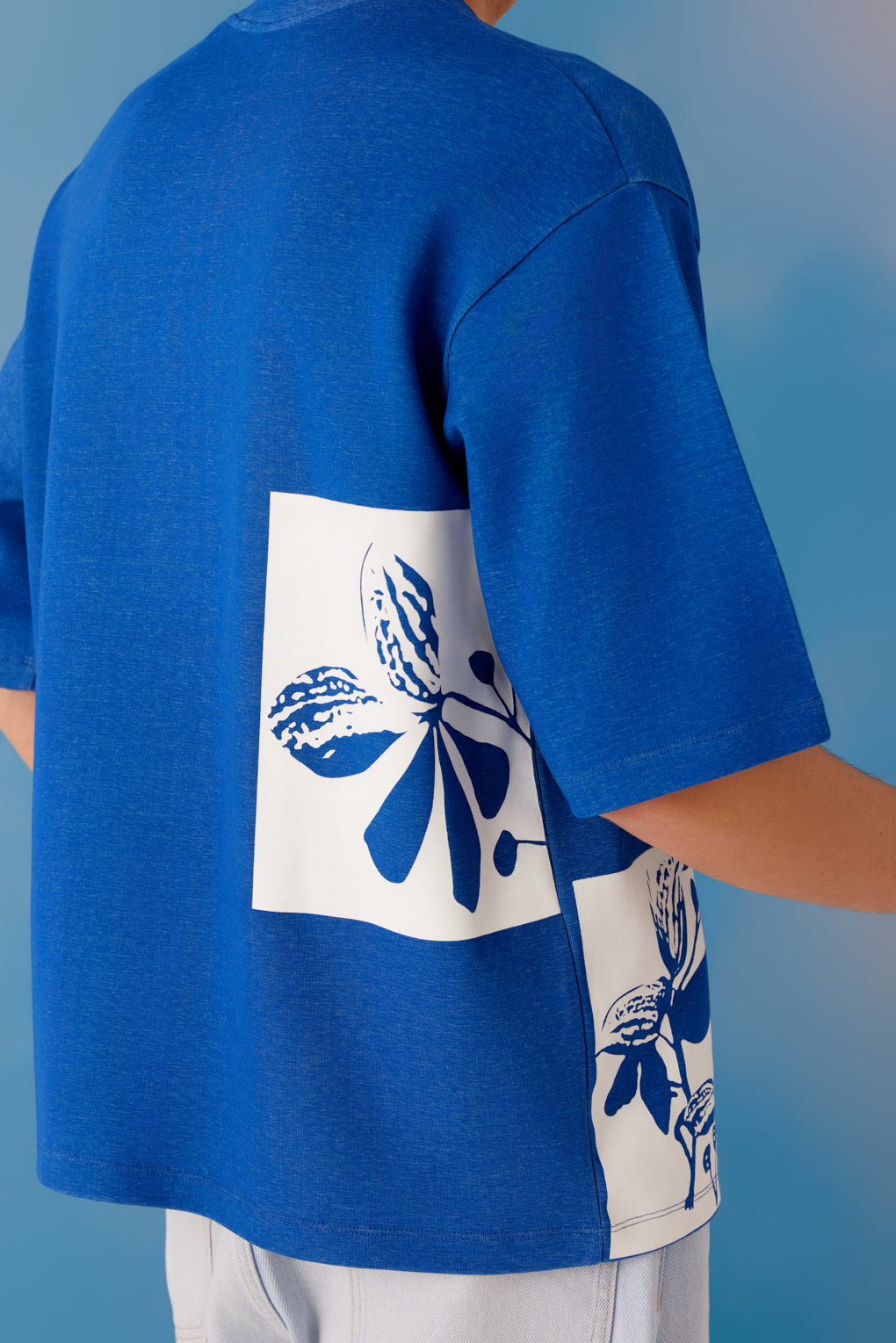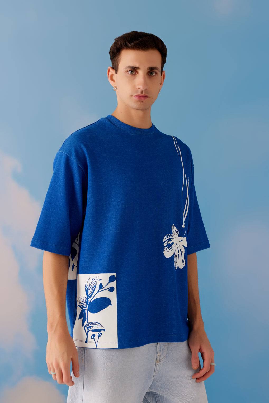 Check out this electric blue tee with a unique placement of floral graphics, crafted from comfortable fabric.