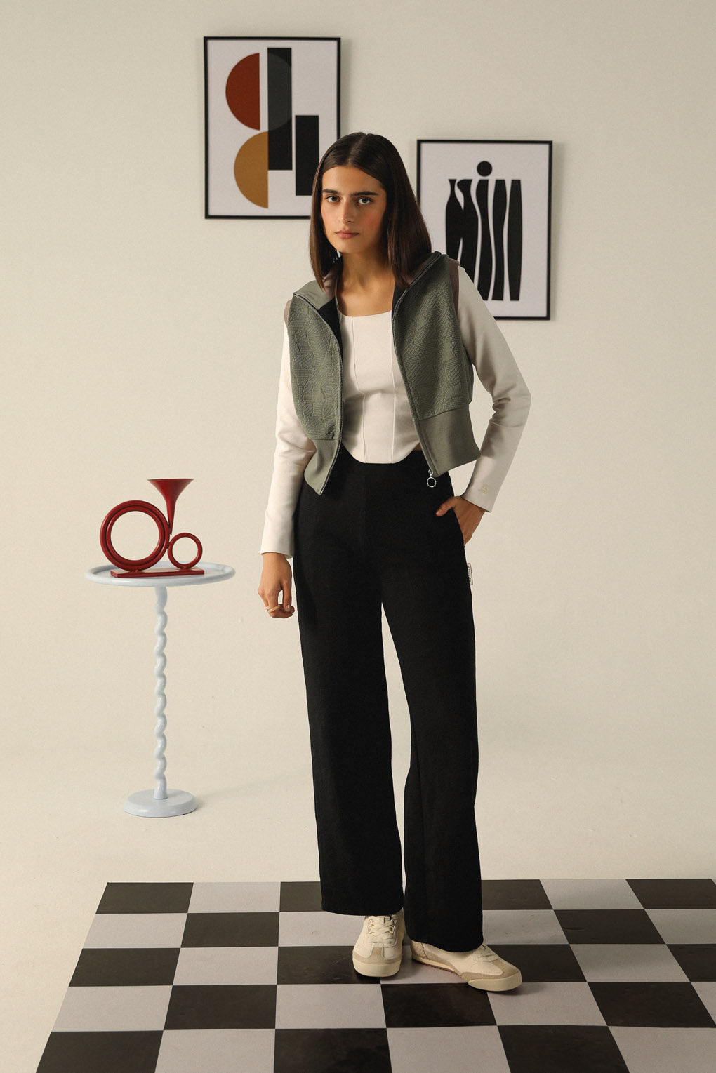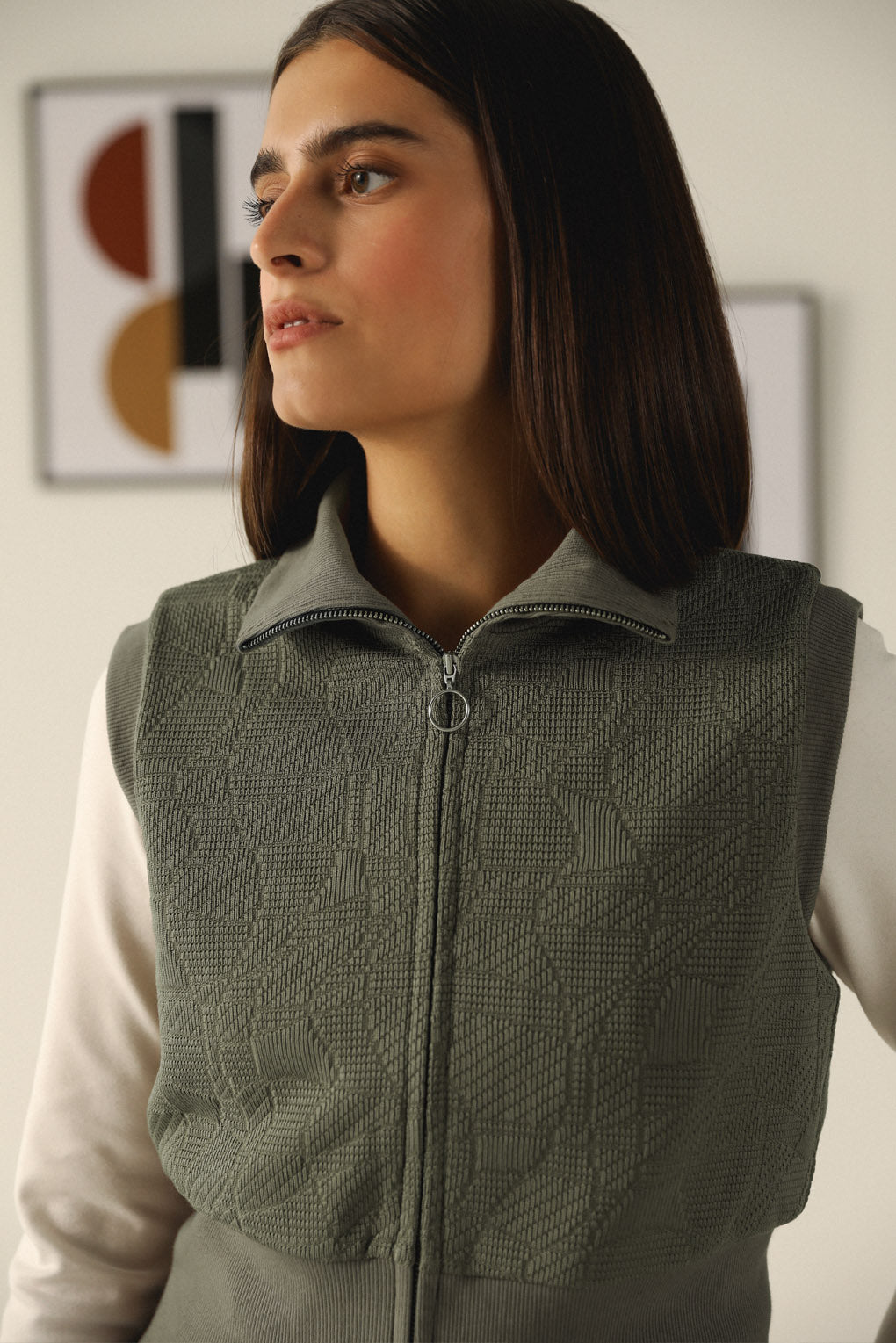 Elevate your style with the Ebony Weave Jacket, meticulously crafted from luxurious knitted jacquard fabric for a textured and elegant appearance. This jacket features a high ribbed neckline, providing a snug yet stylish fit, while the front is highlighted by a sleek ring zipper for a modern touch. Ideal for layering, the sleeveless design seamlessly combines comfort with contemporary flair. The jacquard fabric imparts a sophisticated edge, making it perfect for casual outings or layering over more polished outfits. Whether paired with pants or skirts, this jacket is a versatile and chic addition to your wardrobe, blending fashion with function.