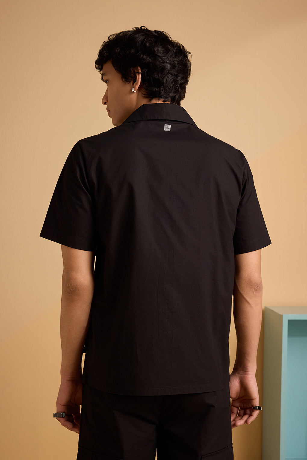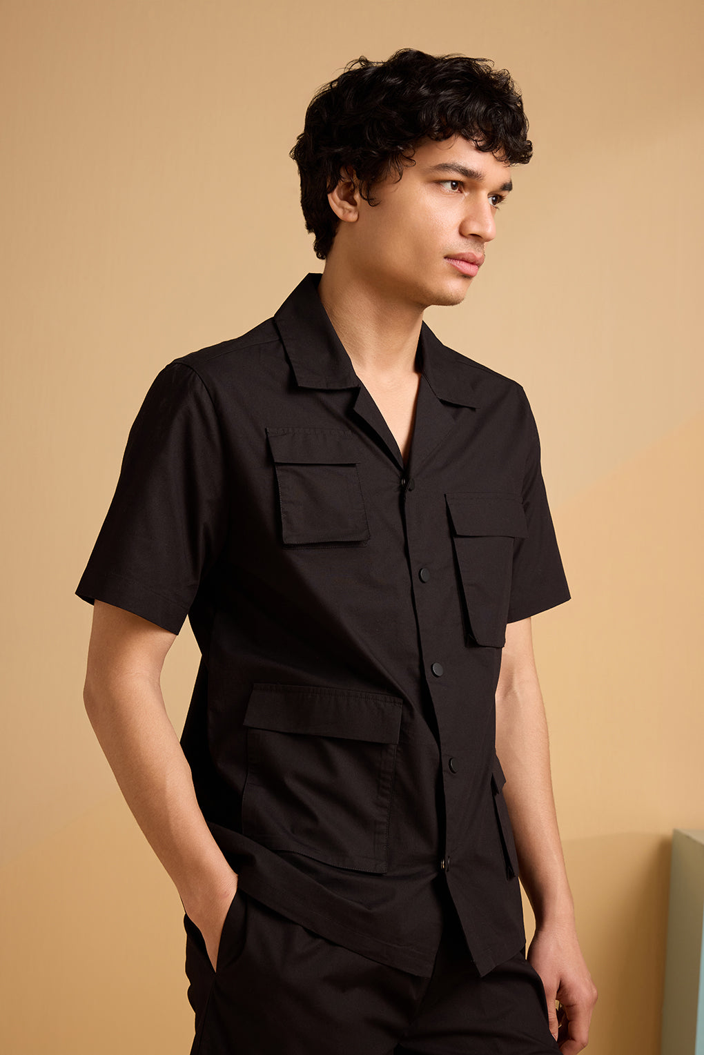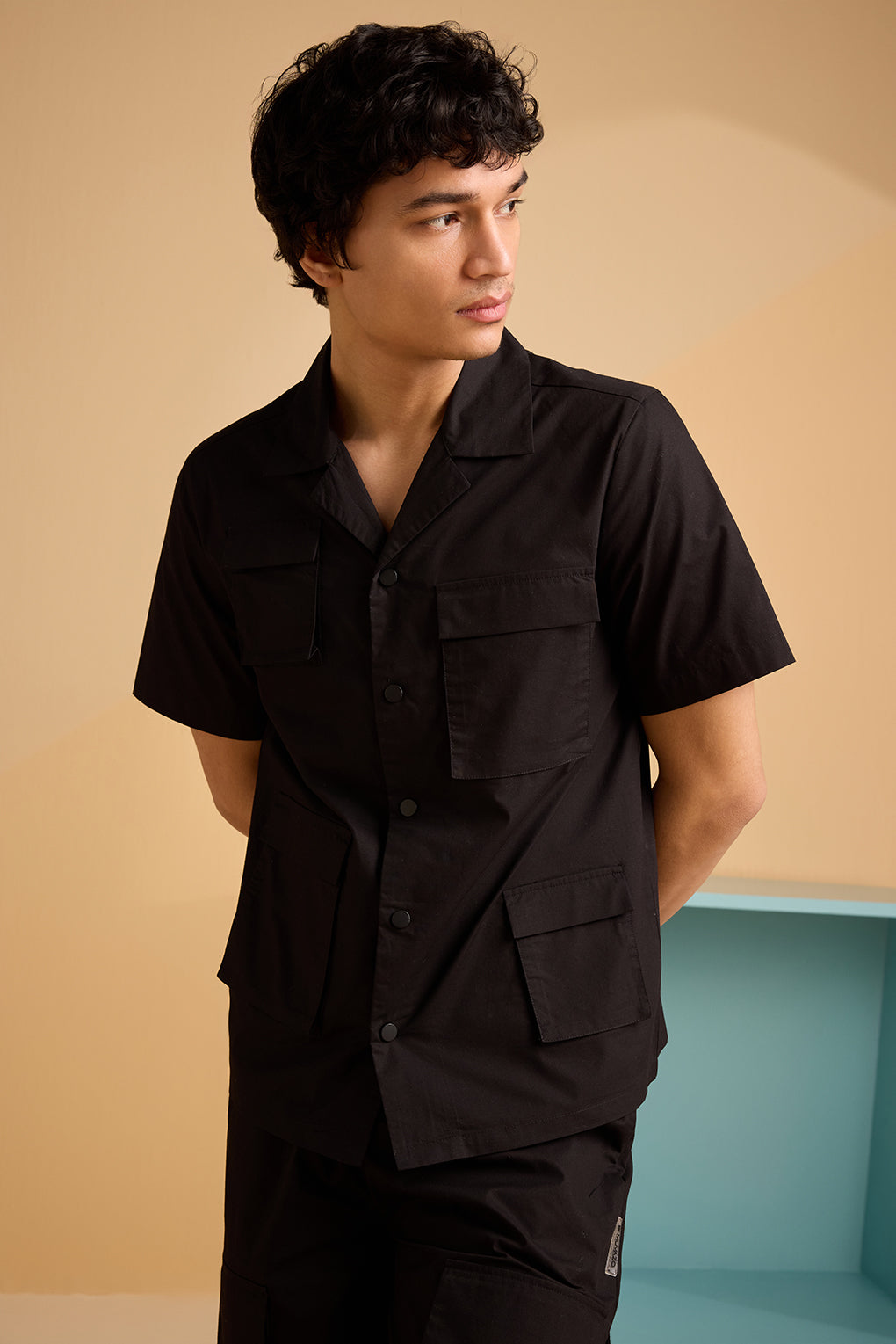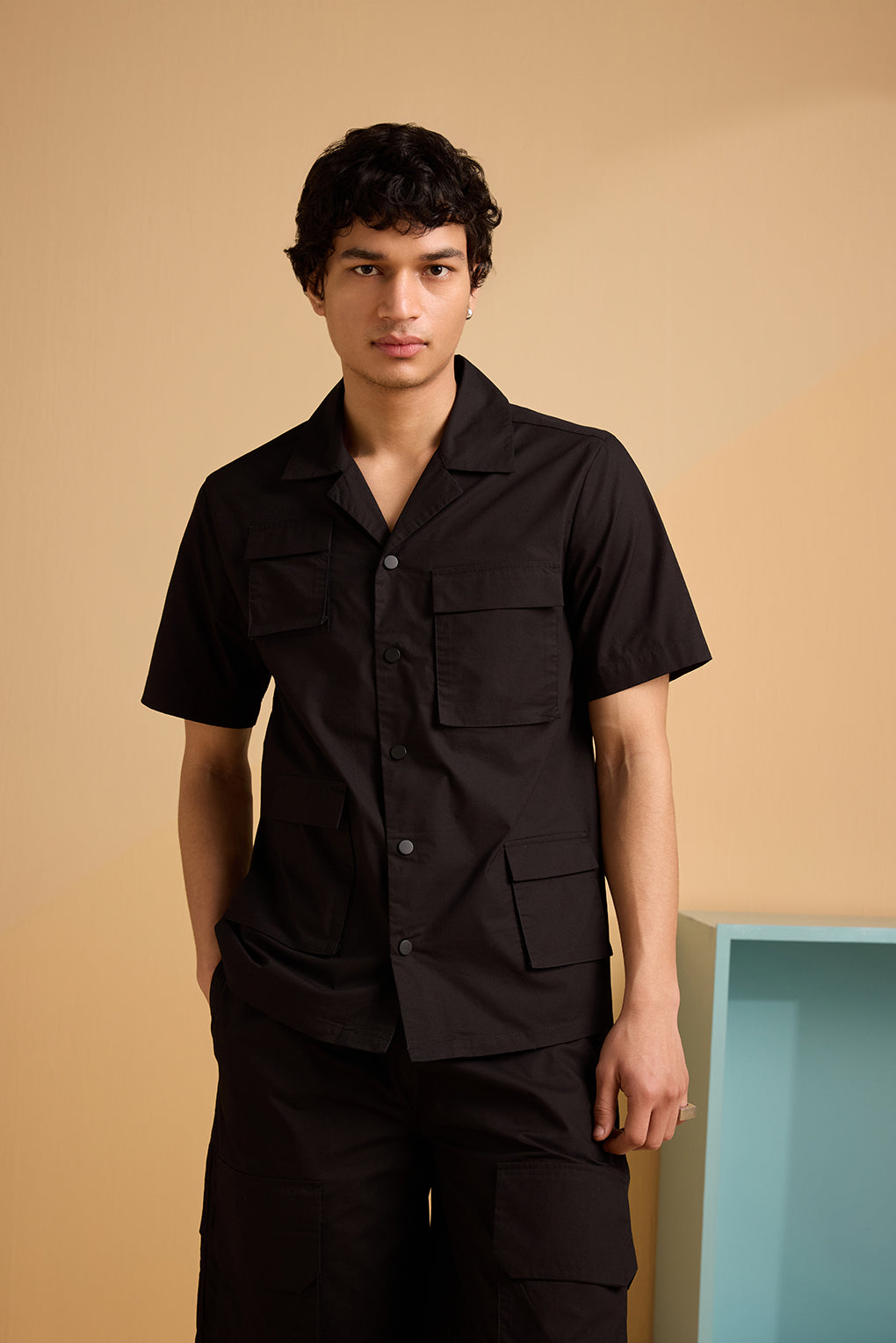Explore this black shirt with a snap placket and 3D pockets scattered all over, lending it a distinctive appearance.