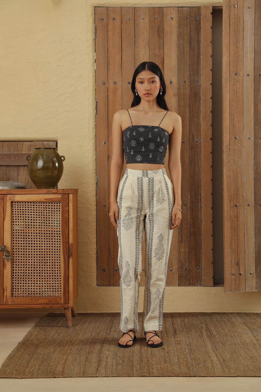 1. For a coordinated look, wear them with our embroidered boteh jacket and tailored printed boteh pant.