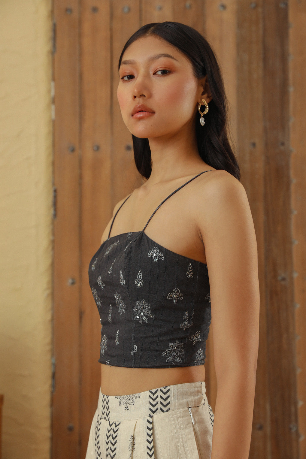 Embrace elegance with our Embroidered Boteh Tank, featuring a traditional paisley print on cotton dobby fabric. This chic piece is beautifully highlighted with cutdana handwork and includes a modern sleeve zipper detail, offering a unique blend of cultural sophistication and contemporary style