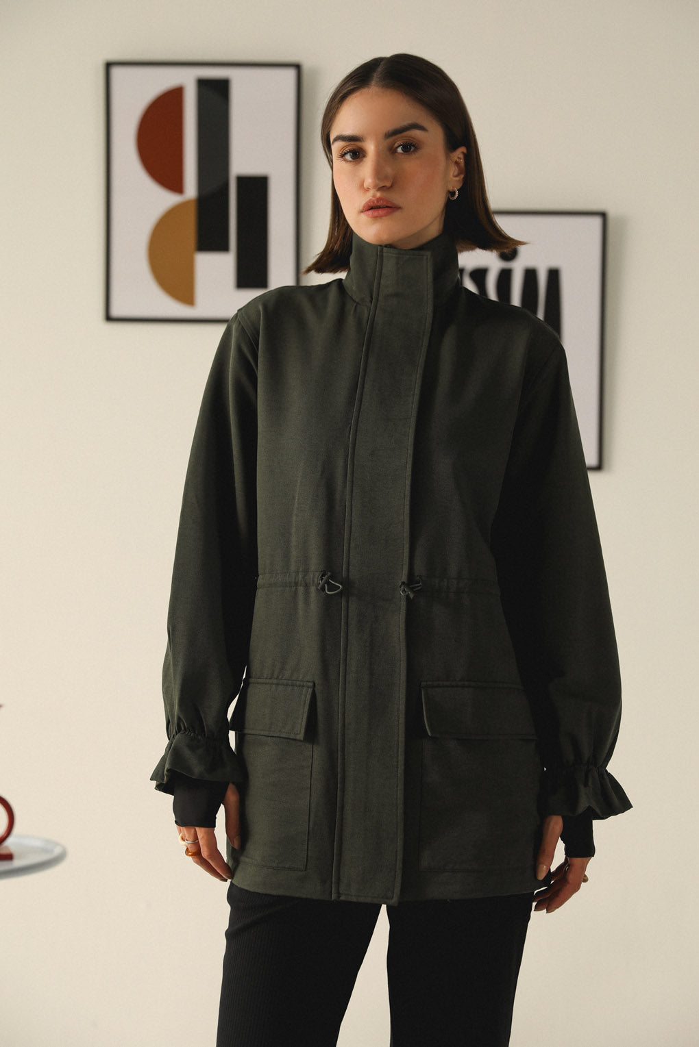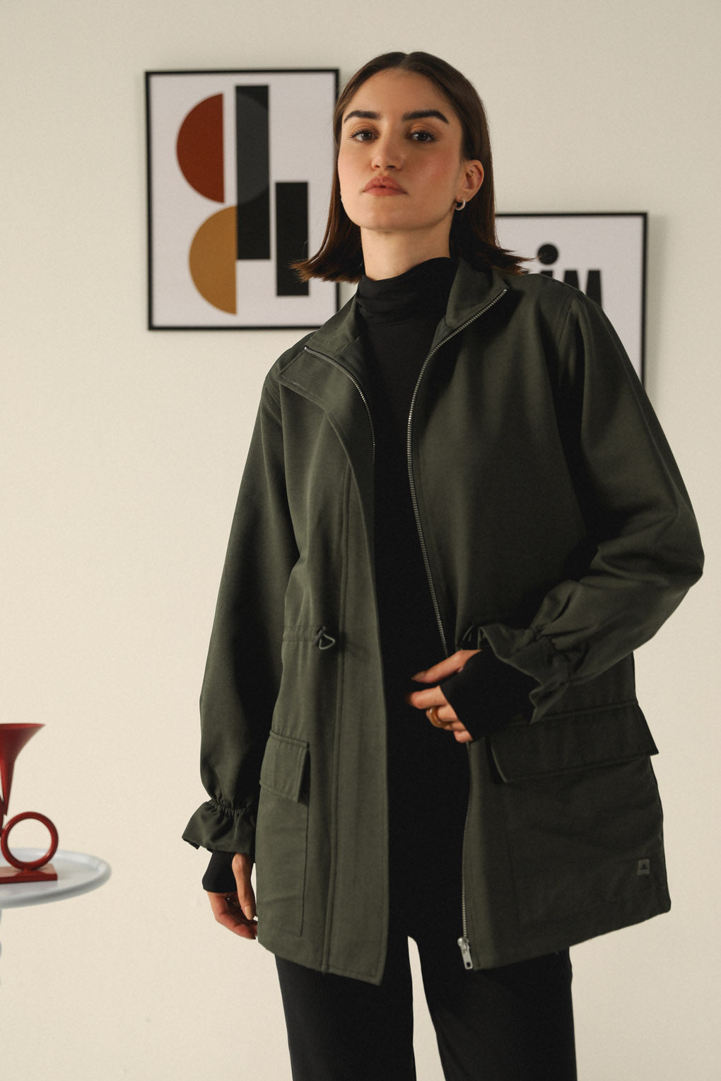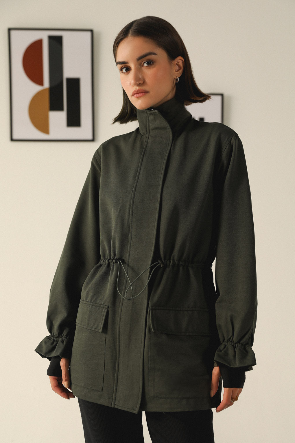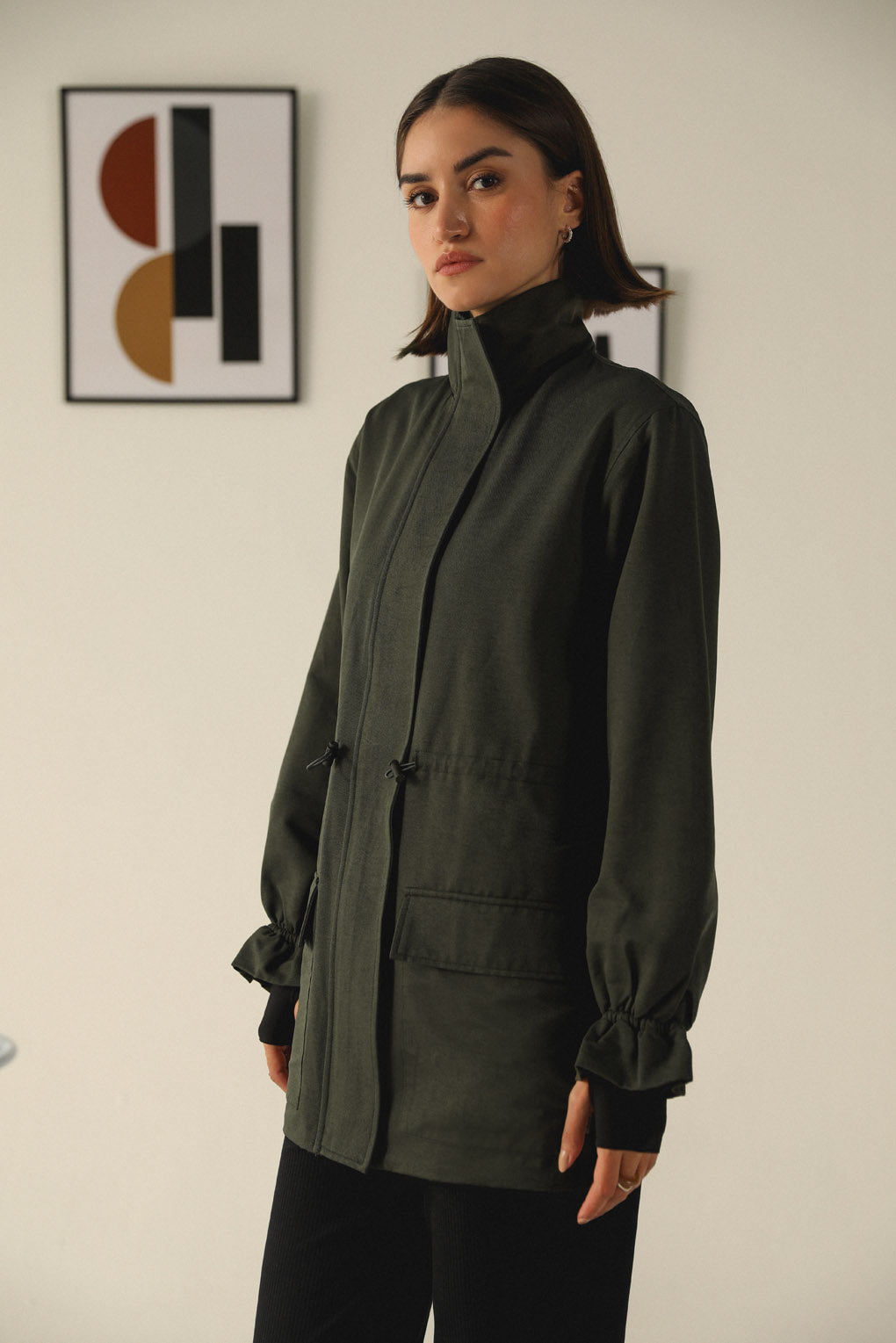 Stay warm and effortlessly stylish with our Emerald Echo Jacket, crafted for the modern woman who values both functionality and fashion. Designed with a longer silhouette for added warmth, this jacket features a toggle elastic waist that lets you adjust the fit for a flattering, cinched look. With spacious front pockets, it offers practical storage while adding a touch of utility-chic style. The high neck with a front zipper closure provides extra protection against the cold, making it perfect for chilly days. Its streamlined design and premium materials ensure a polished yet cozy look.