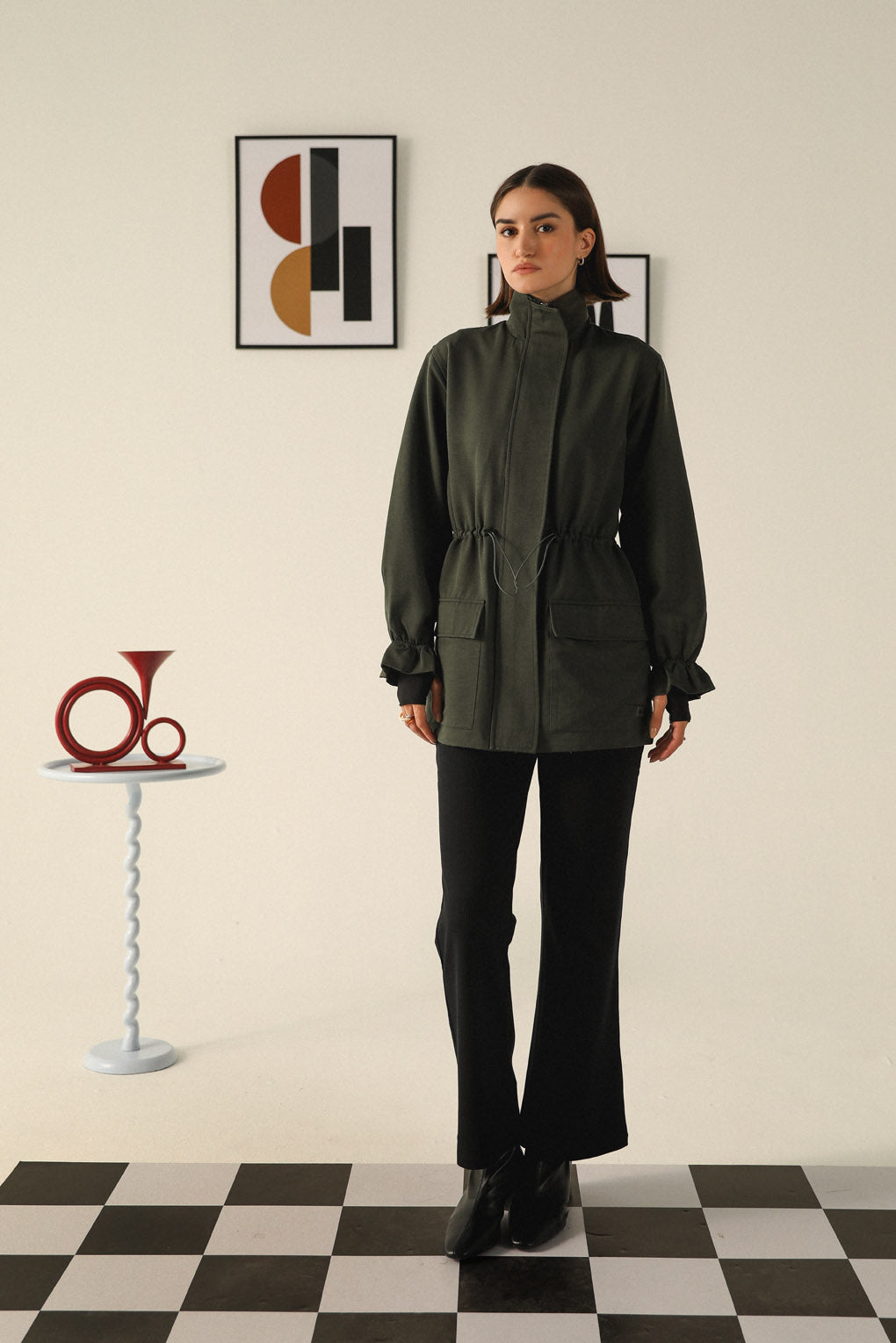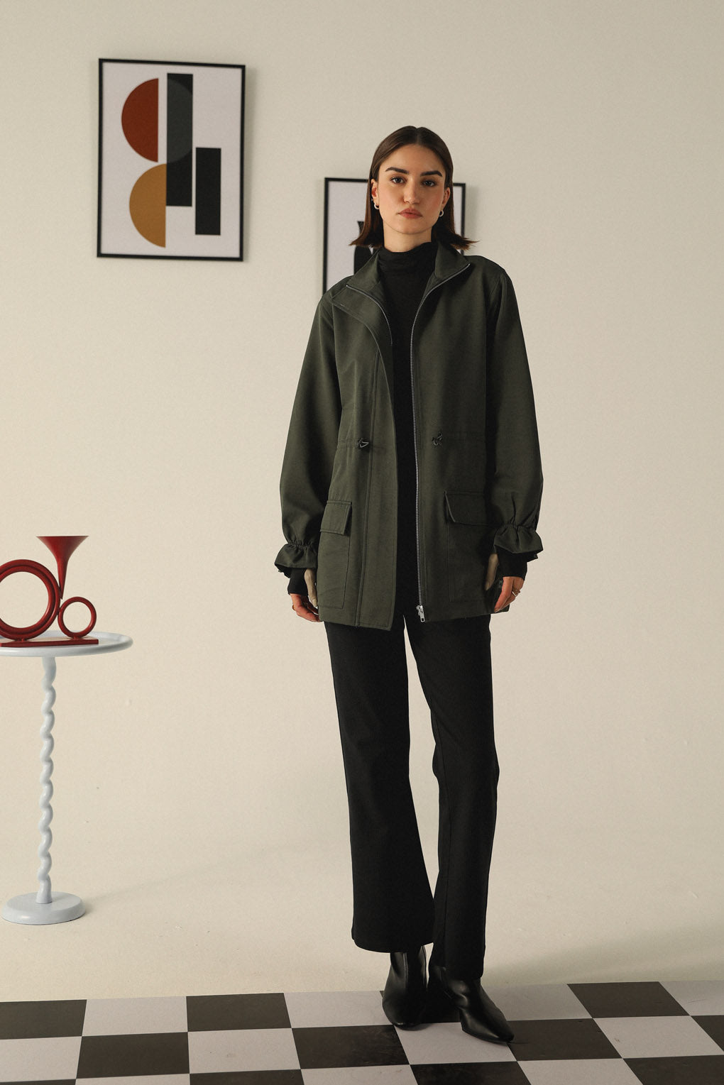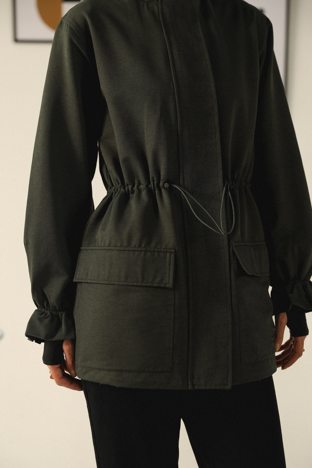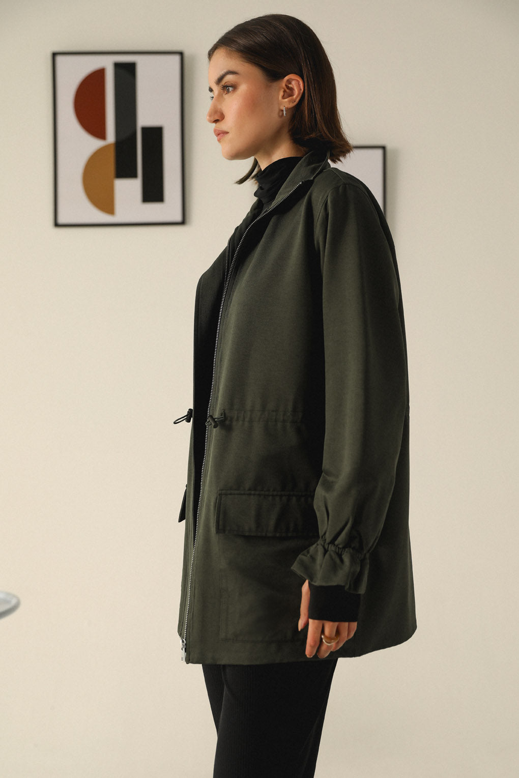 Stay warm and effortlessly stylish with our Emerald Echo Jacket, crafted for the modern woman who values both functionality and fashion. Designed with a longer silhouette for added warmth, this jacket features a toggle elastic waist that lets you adjust the fit for a flattering, cinched look. With spacious front pockets, it offers practical storage while adding a touch of utility-chic style. The high neck with a front zipper closure provides extra protection against the cold, making it perfect for chilly days. Its streamlined design and premium materials ensure a polished yet cozy look.
