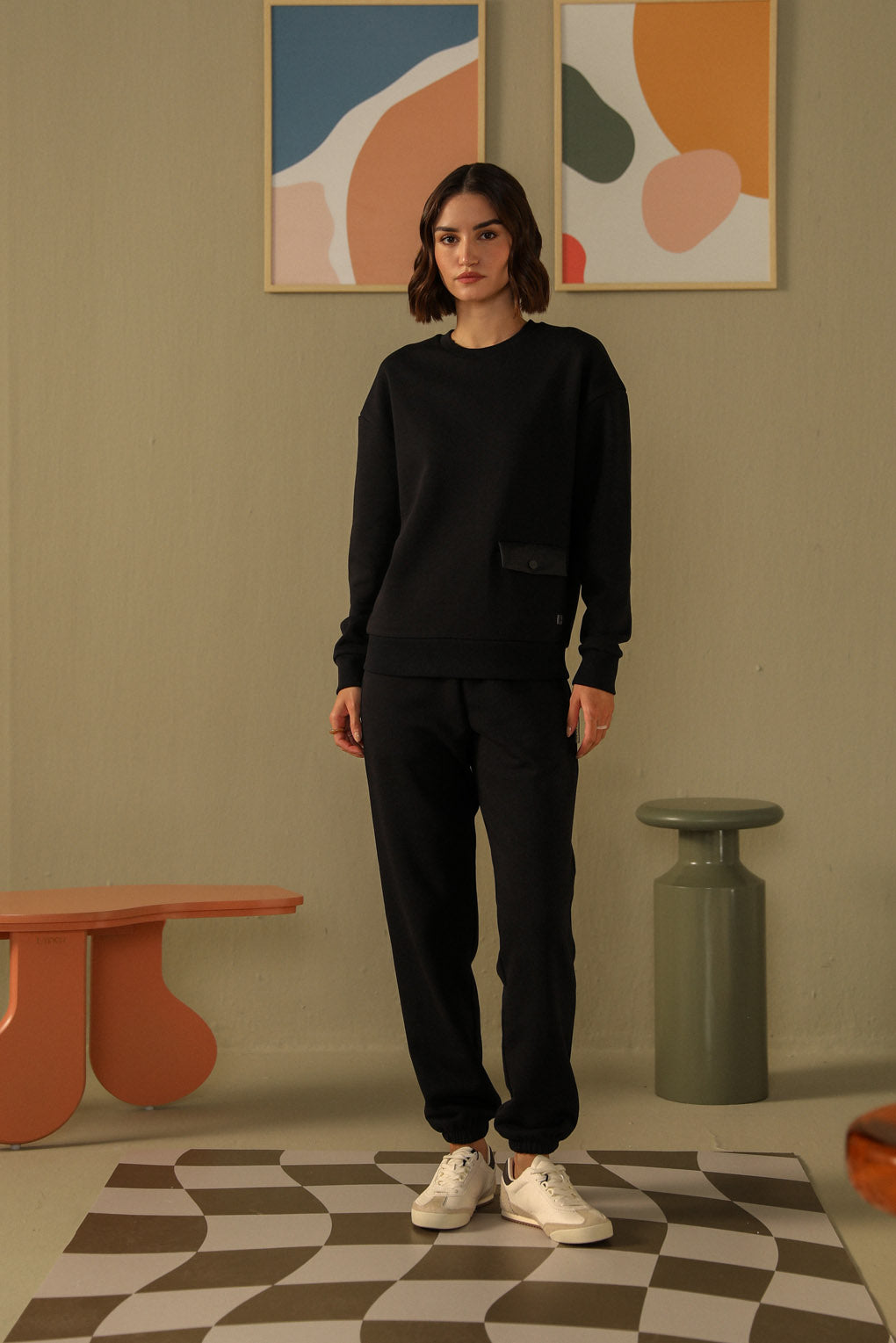 Stay effortlessly stylish and snug in our Essence of Warmth Co-ord Set, the ultimate blend of comfort and sophistication. Made from ultra-soft, warm fleece, this set includes a cozy sweatshirt with taffeta pocket detailing on the side front, paired with matching joggers for a chic, coordinated look that’s perfect for cooler days. The sweatshirt offers a relaxed fit, with the side-front taffeta pocket adding a modern touch of refinement. The joggers feature a comfortable waistband and a relaxed fit, making this set ideal for lounging at home or stepping out in style.
