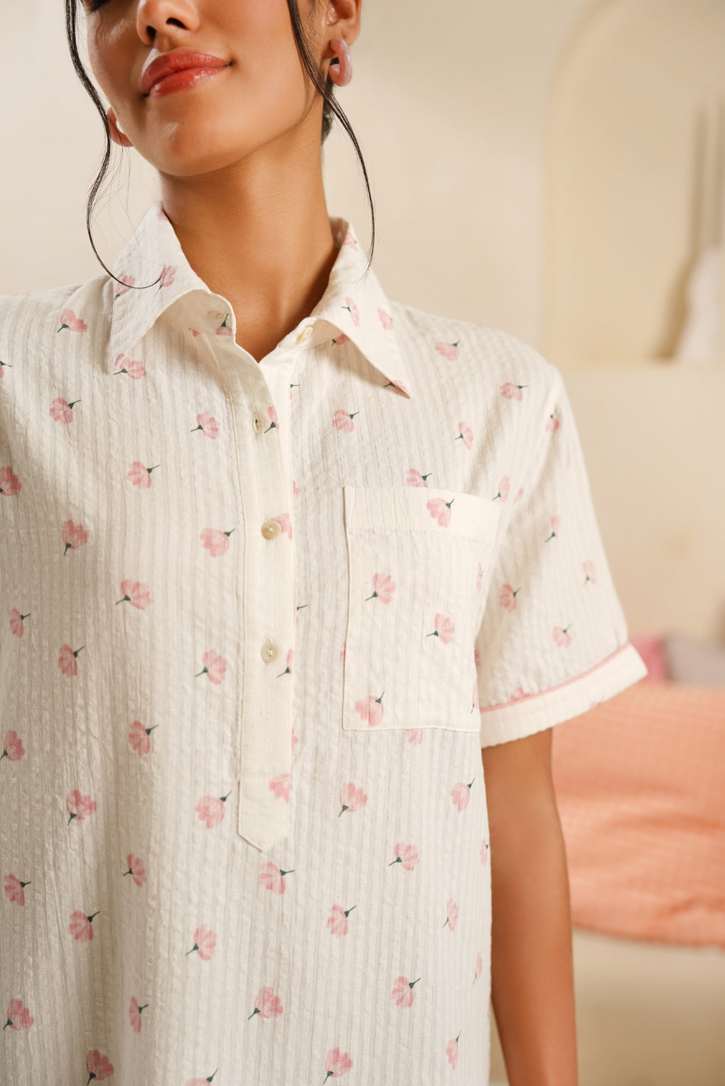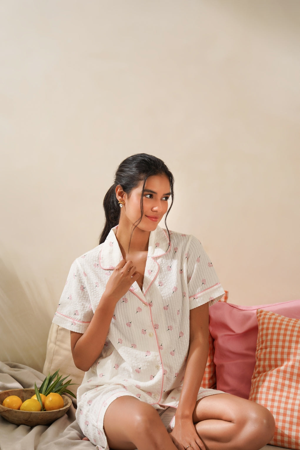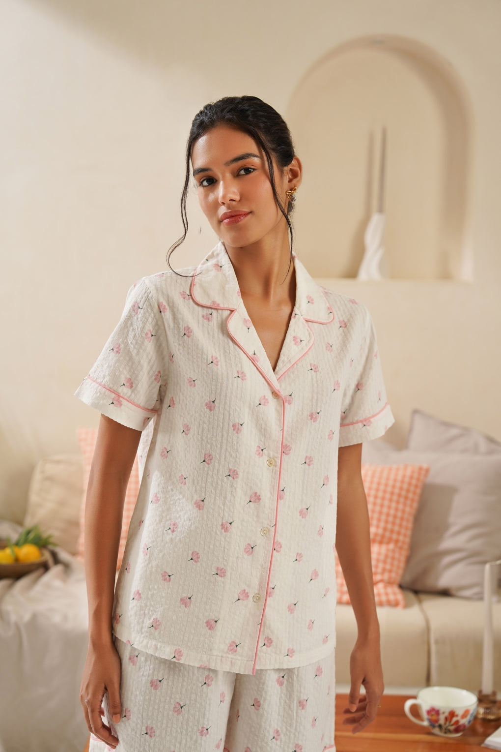 Designed for refined relaxation, the Fioretta Allure Shirt is made from soft, breathable seersucker cotton with an all-over floral motif. Featuring a notched collar, contrast piping, and a button-down front, this shirt brings a polished touch to your night time routine. The textured fabric adds a natural softness, making it a wardrobe essential for unwinding in luxury.