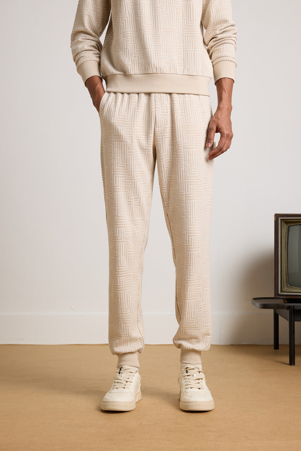 Upgrade your casual wear with our Grid-Glide Joggers. Featuring a sleek and tailored look, these joggers combine style and functionality. The jacquard fabric offers a textured, high-quality finish that blends the softness of cotton with the durability of polyester. The elastic waistband with an adjustable drawstring provides a secure and personalised fit. Perfect for lounging, workouts, or casual outings, these joggers offer effortless movement and comfort, making them a versatile essential for your everyday wardrobe.