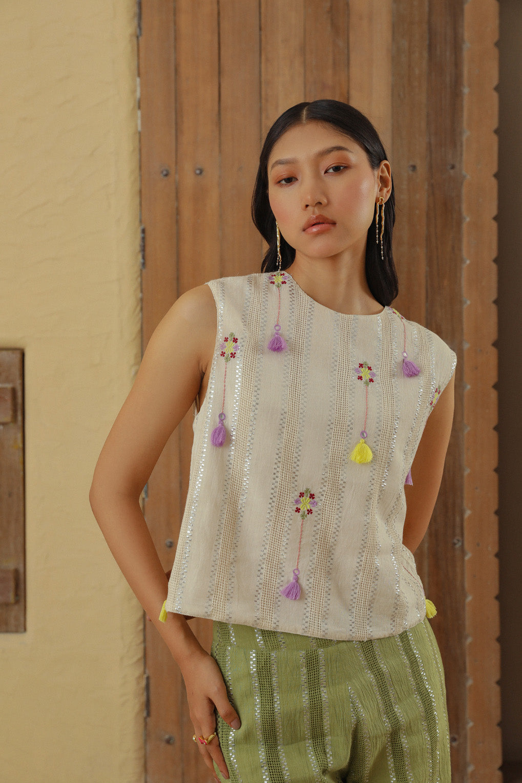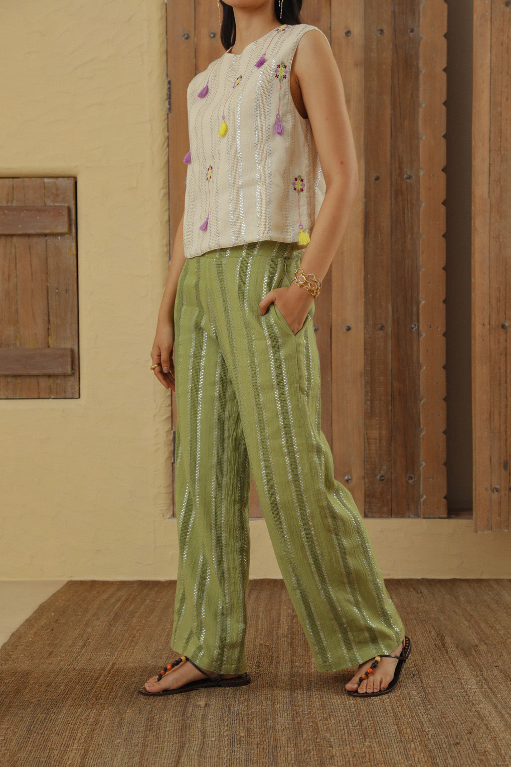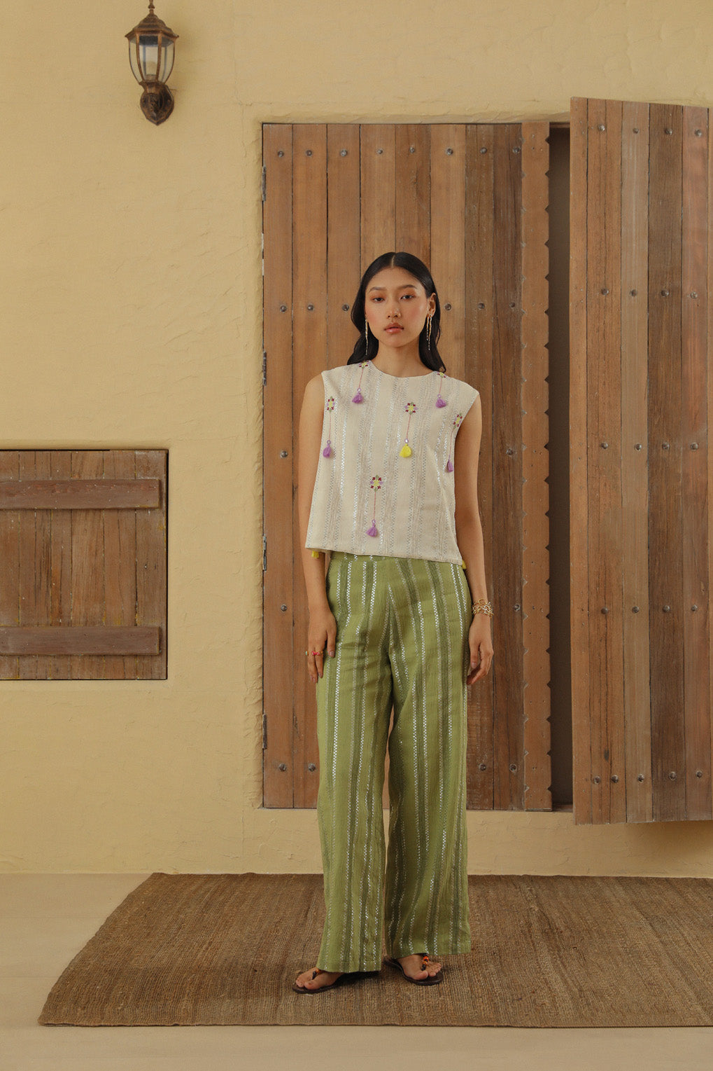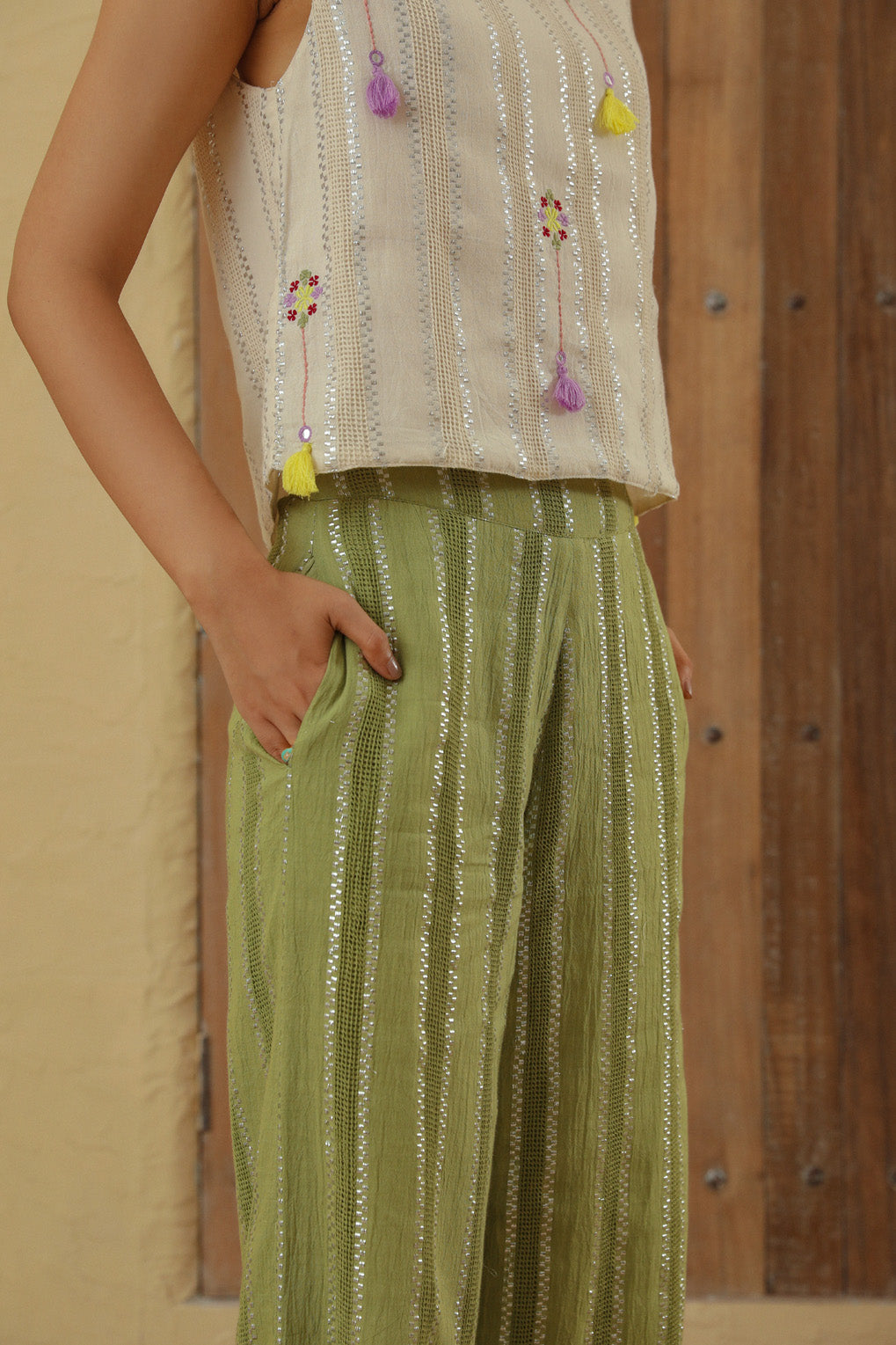 Embrace a blend of cultural charm and contemporary style with our Lurex Weave Co-ord Set, featuring a boxy top adorned with traditional ditsy floral embroidery, mirror and tassel handwork, paired with contrast lurex dobby flared pants. This exquisite ensemble is perfect for both special occasions and chic everyday wear, offering a unique combination of intricate craftsmanship and modern design.