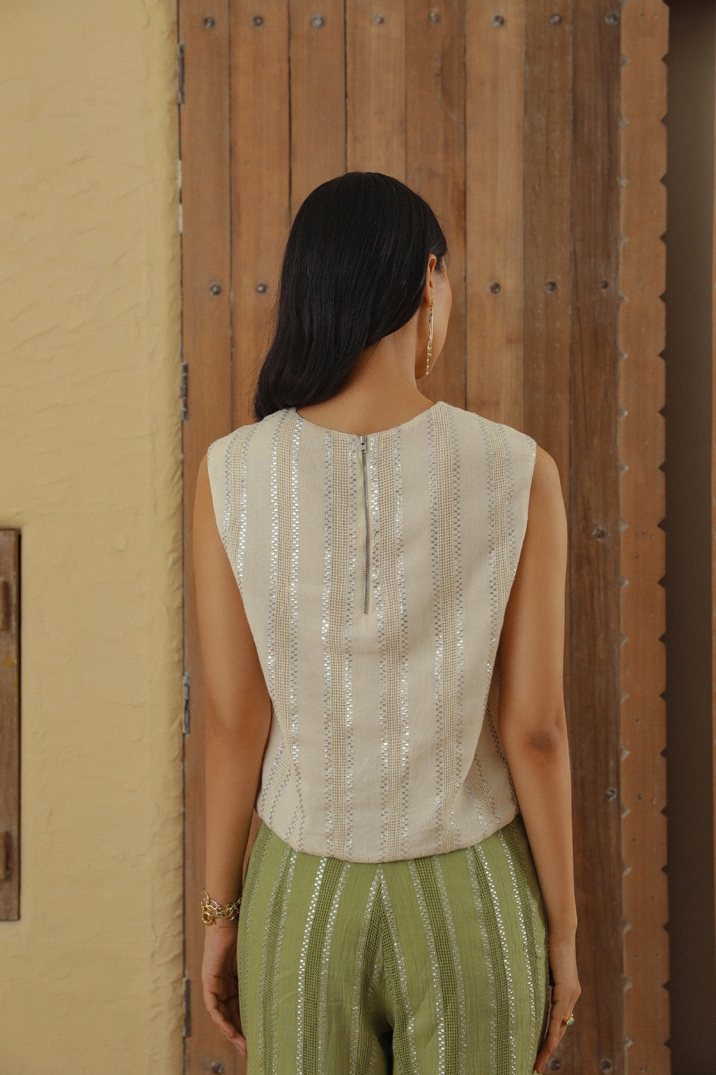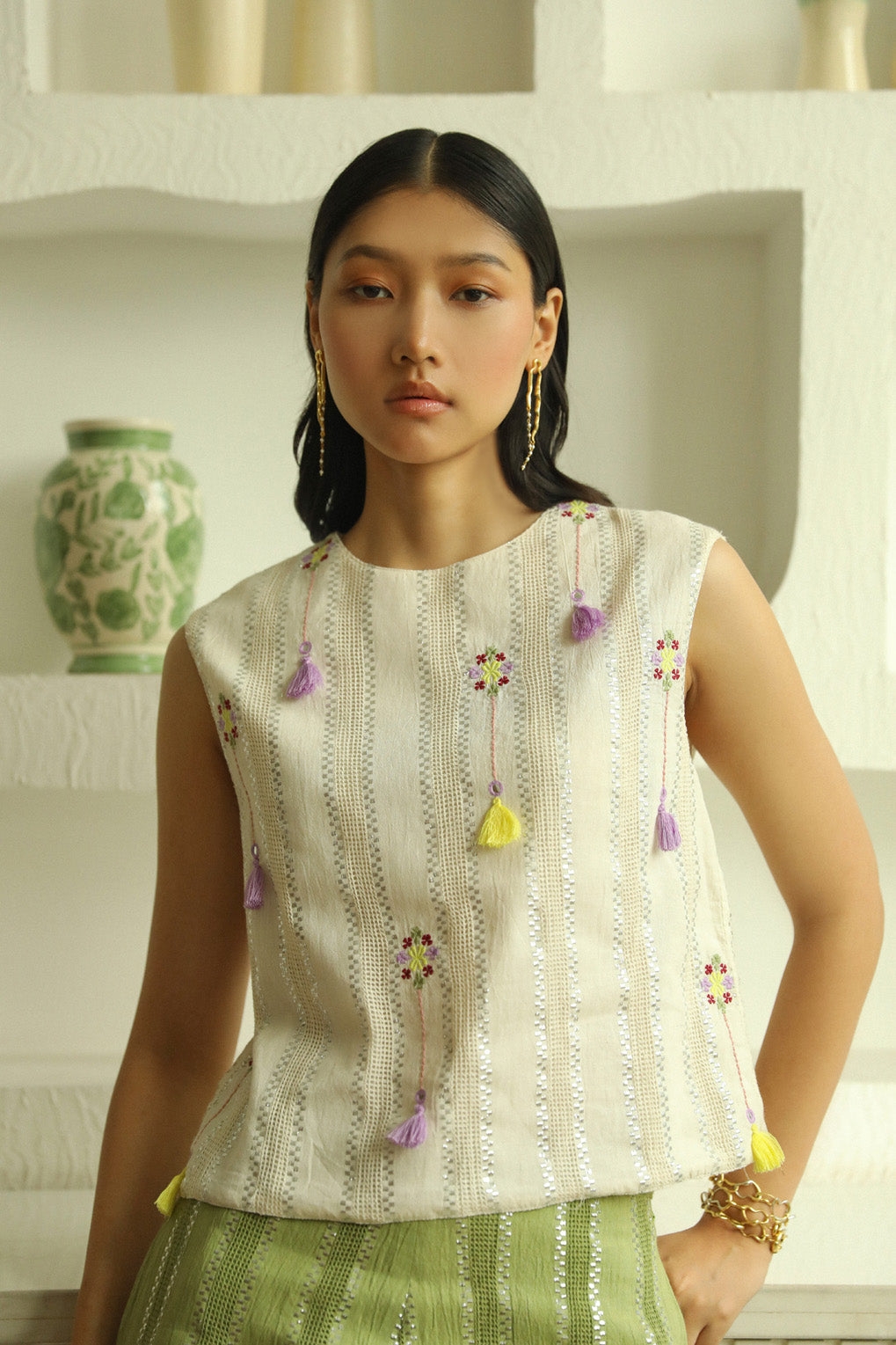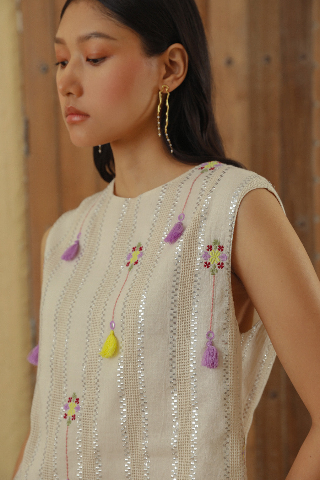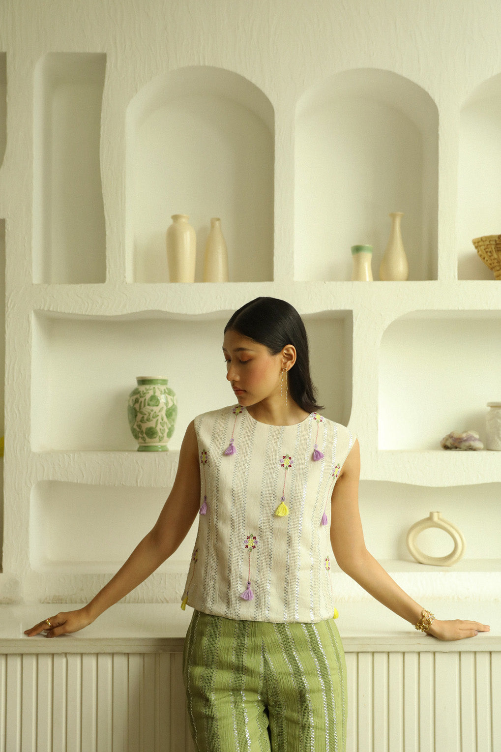 Embrace a blend of cultural charm and contemporary style with our Lurex Weave Co-ord Set, featuring a boxy top adorned with traditional ditsy floral embroidery, mirror and tassel handwork, paired with contrast lurex dobby flared pants. This exquisite ensemble is perfect for both special occasions and chic everyday wear, offering a unique combination of intricate craftsmanship and modern design.