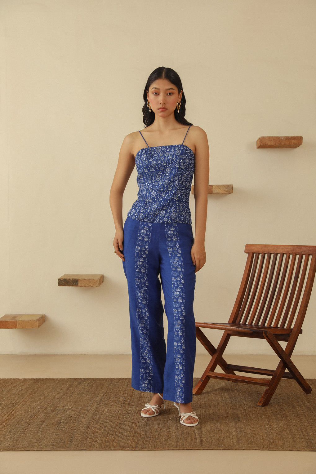 Step out in style with our elegant chanderi pants, featuring the traditional Mayuri Chitra arranged in a unique stripe pattern. Designed for a tailored yet relaxed fit, these pants flatter your silhouette while ensuring ample comfort. The straight-leg cut adds a touch of sophistication to the overall look, making them a refined choice for any occasion.
