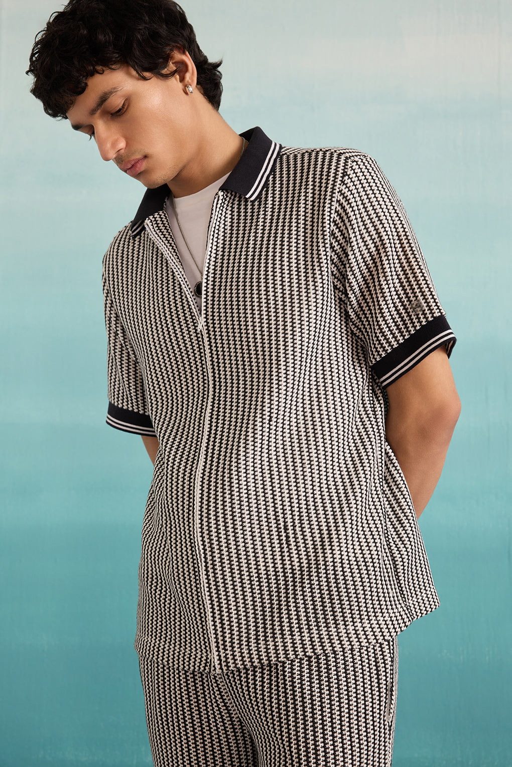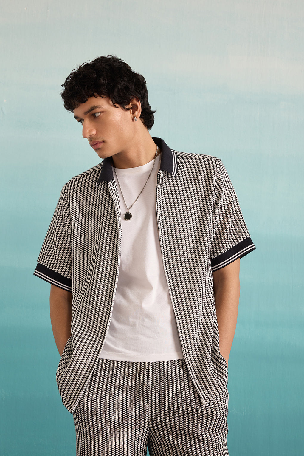 Want to look your trendiest while enjoying immense comfort? Get this Monochrome Looper Shirt crafted from exquisite crochet fabric with solid collar and cuff details, perfect for adding a touch of sophistication to your summer wardrobe. Experience the perfect combination of style, comfort, and sophistication for any occasion.