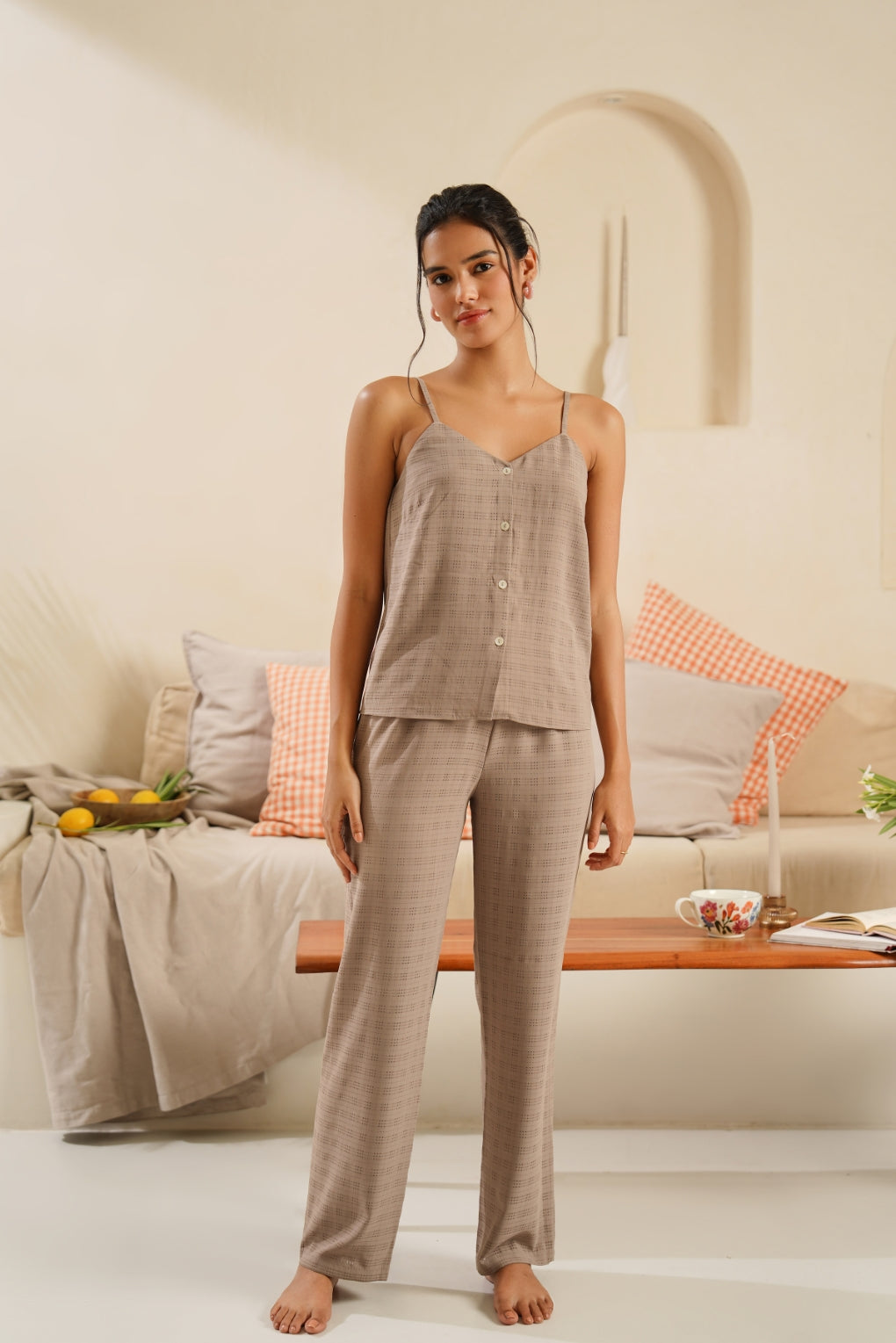 Indulge in effortless comfort with this Noctera Pyjama Co-ord Set. Made from ultra-soft, breathable fabric with a subtle woven check pattern, it offers a perfect balance of elegance and ease. The lightweight texture drapes gracefully, ensuring a relaxed yet refined fit, while delicate button-down details add a sophisticated touch. Designed for lounging in style, the soft elasticated waistband in pyjama provides a secure and cozy feel. Whether you're unwinding after a long day or easing into a slow morning, this set is your go-to for ultimate relaxation.
