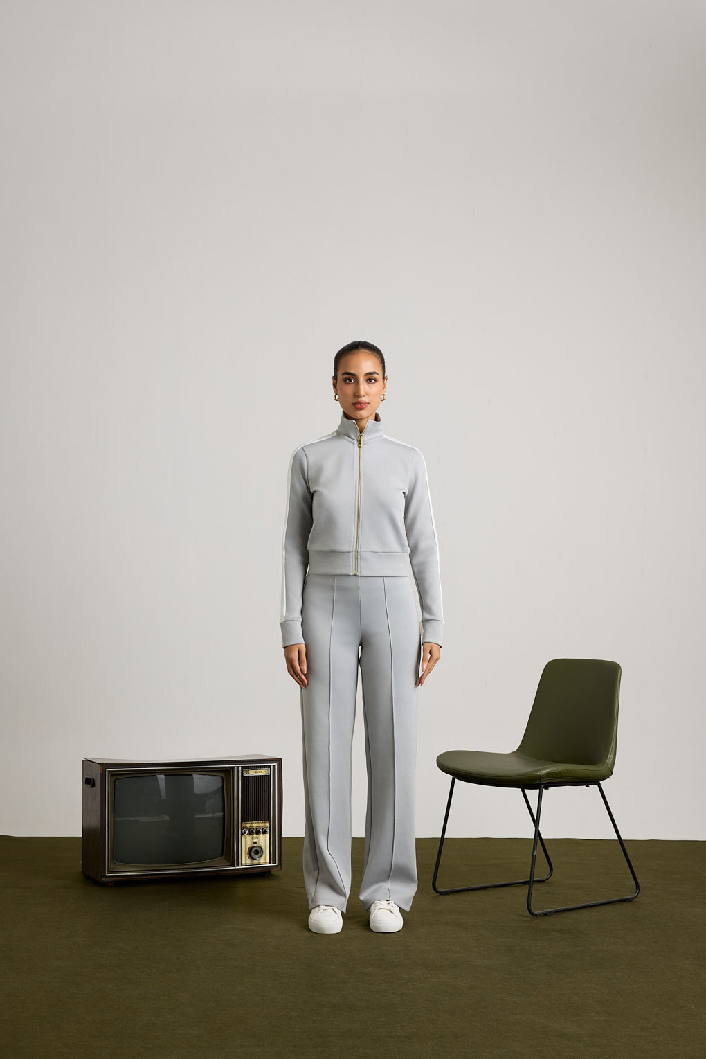 Elevate your wardrobe with the Opulent Panel Co-ord Set. This set includes a jacket with stylish contrast panels on the sleeves, adding dynamic visual appeal, and a luxurious golden front zipper that serves as a striking detail. The coordinating flared pants feature sophisticated pin-tuck detailing on the front, enhancing their elegant silhouette and adding a touch of refinement. Crafted from high-quality fabric, both pieces offer exceptional comfort and a polished look. Perfect for transitioning from day to night or casual to dressy, this versatile co-ord set effortlessly blends contemporary style with classic sophistication.