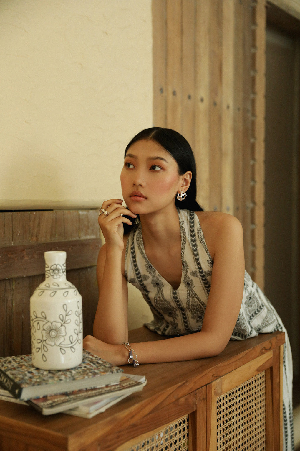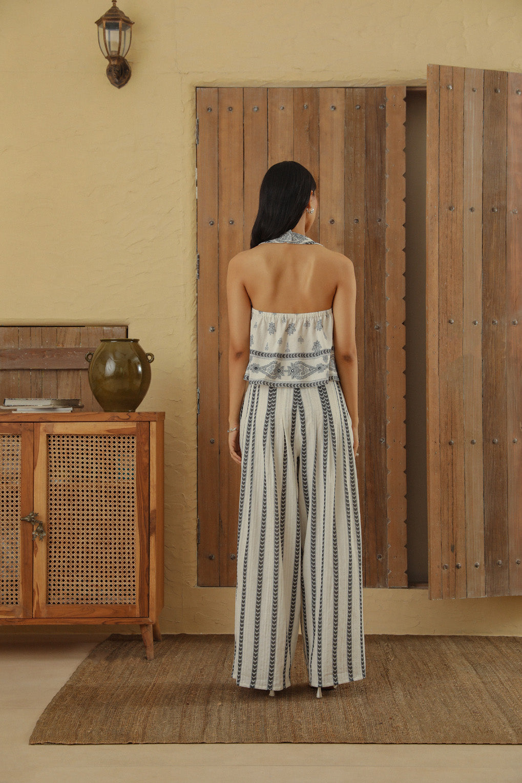 Experience the epitome of elegance and style with our Paisley Fusion Co-ord Set, featuring a halter neck top adorned with a traditional paisley print and highlighted with intricate handwork, paired with pleated flared pants in a matching print. This sophisticated ensemble combines cultural heritage with contemporary flair, making it perfect for both special occasions and refined everyday wear. Crafted from high-quality dobby fabric, the halter neck top offers a smooth, comfortable feel with a flattering drape, while the rich texture enhances the overall aesthetic of the set.