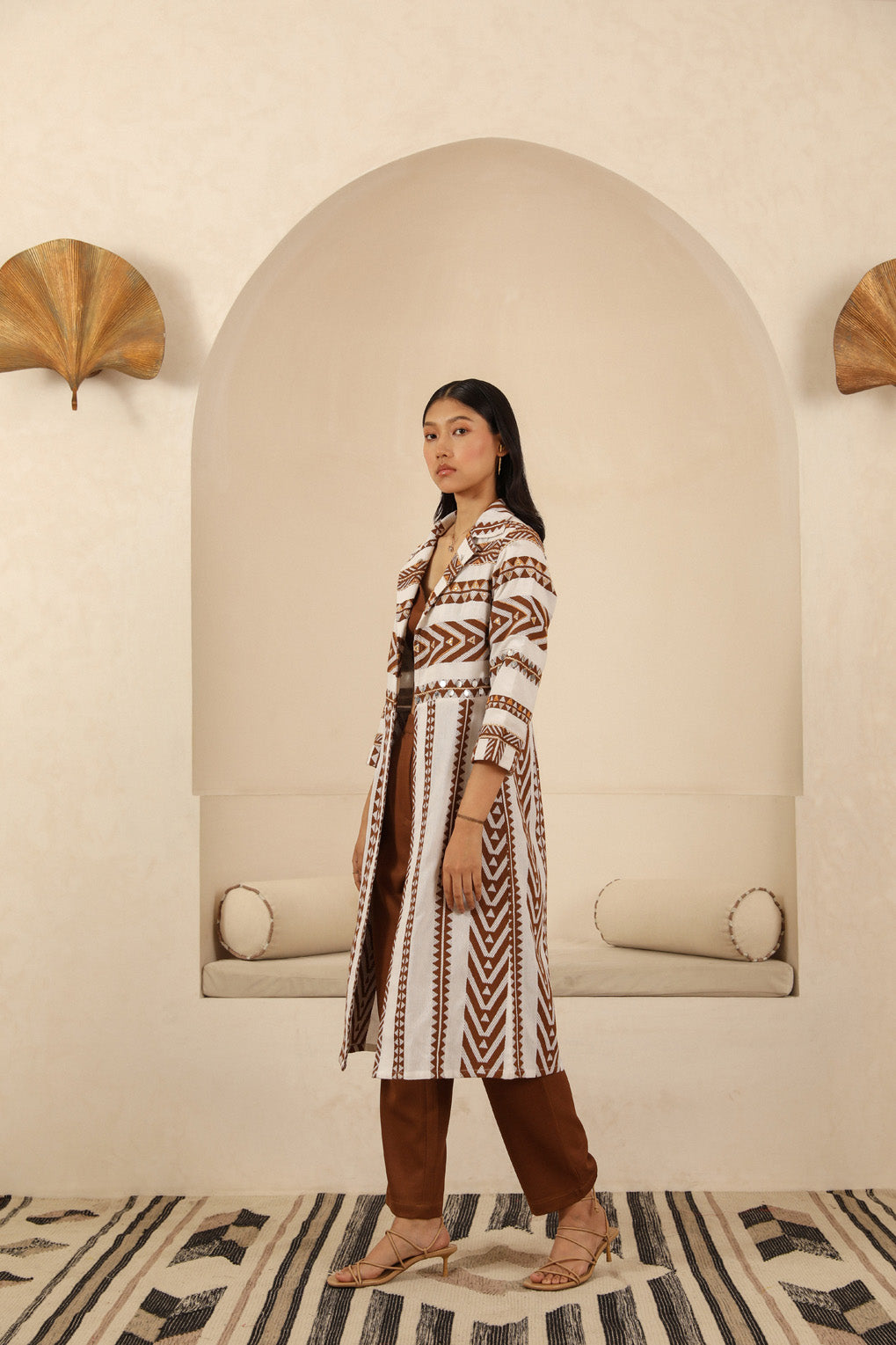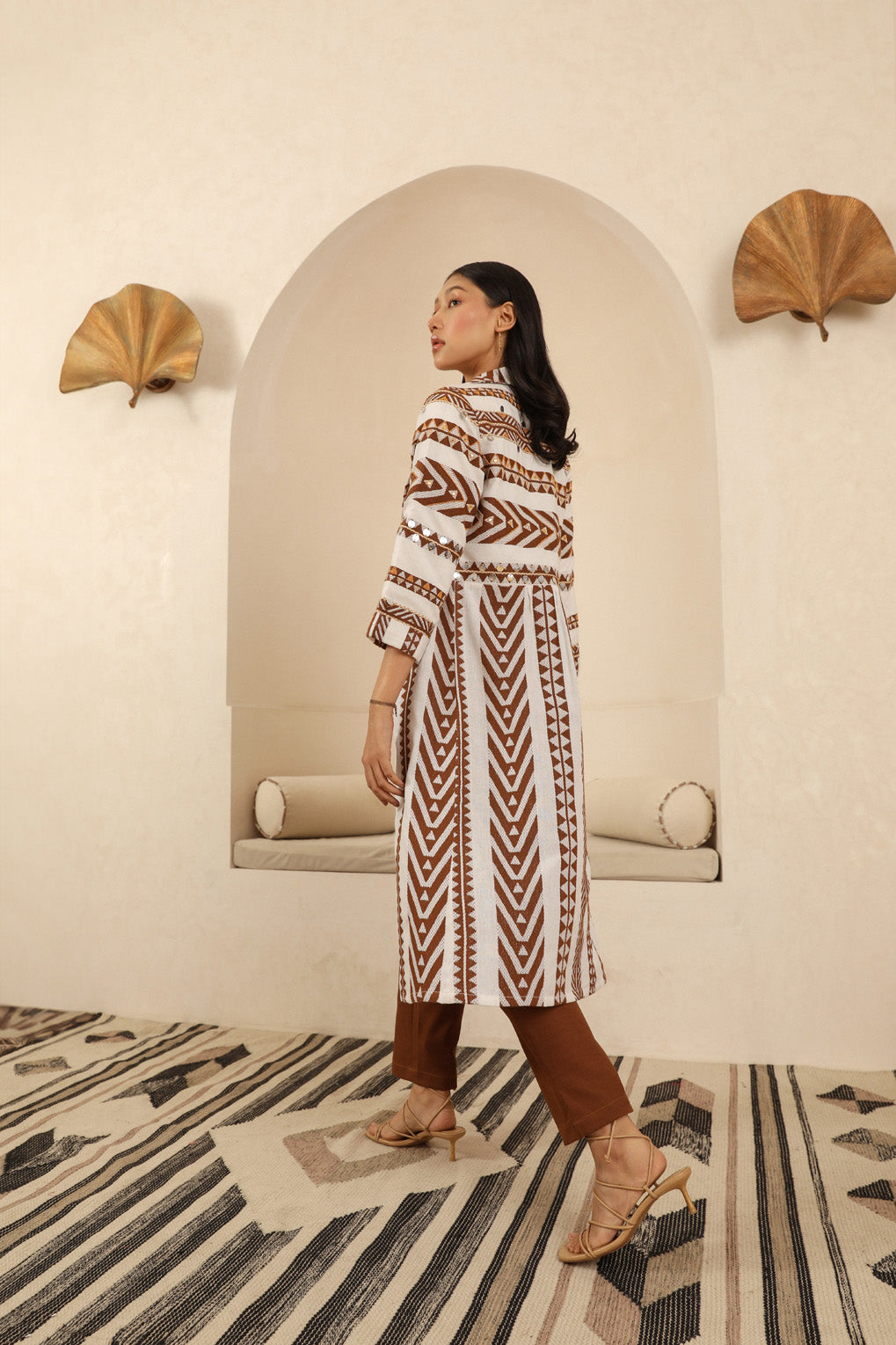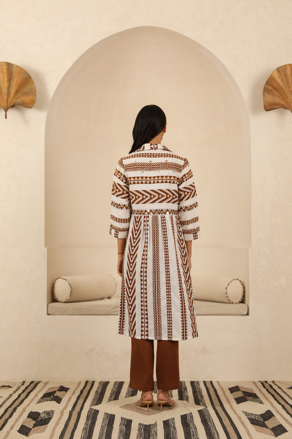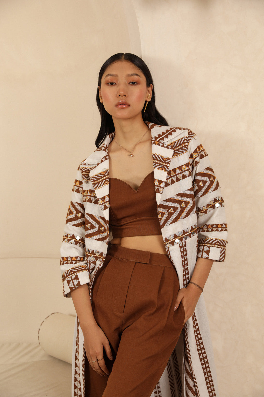 Enhance your ensemble with our Raas Kathia Shrug, featuring a traditional jacquard pattern highlighted with intricate mirror, beads, and coin work, along with contrast thread handwork. The traditional jacquard pattern showcases culturally inspired designs, adding depth and elegance to the shrug. The woven motifs provide a timeless and sophisticated appeal. The long length of the shrug provides ample coverage and creates a flowing, elegant silhouette. It drapes beautifully over the body, adding a layer of sophistication to any outfit.