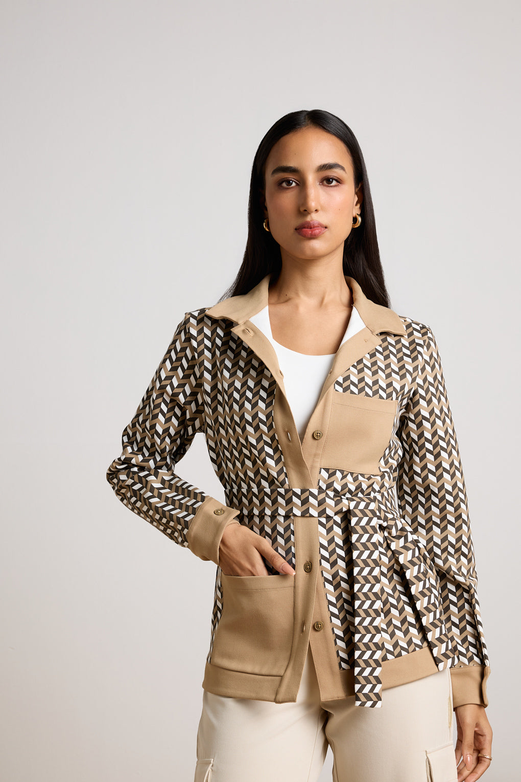 Transform your wardrobe with the dynamic Vogue Vista Shirt, featuring a vibrant geometric pattern that adds a modern edge to a classic design. The contrast panels and asymmetric pockets create unique visual interest, offering a contemporary twist that makes this shirt truly stand out. Crafted from high-quality fabric, it combines comfort with style, making it perfect for both casual and dressed-up occasions. Pair it with your favourite trousers or skirts for an effortlessly chic outfit that makes a bold statement.