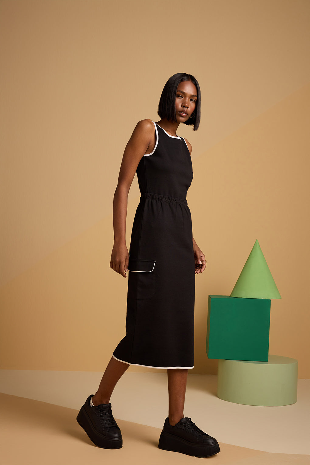 Discover elegance with our sophisticated SlateSnow Dress, crafted in black with white contrast piping to elevate your ensemble. This midi dress is meticulously designed to enhance your overall look, offering a timeless and refined aesthetic. Whether you're attending a formal event or enjoying a night out, this dress exudes sophistication and style. Pair it with heels for a polished finish or layer with a blazer for a chic office look.