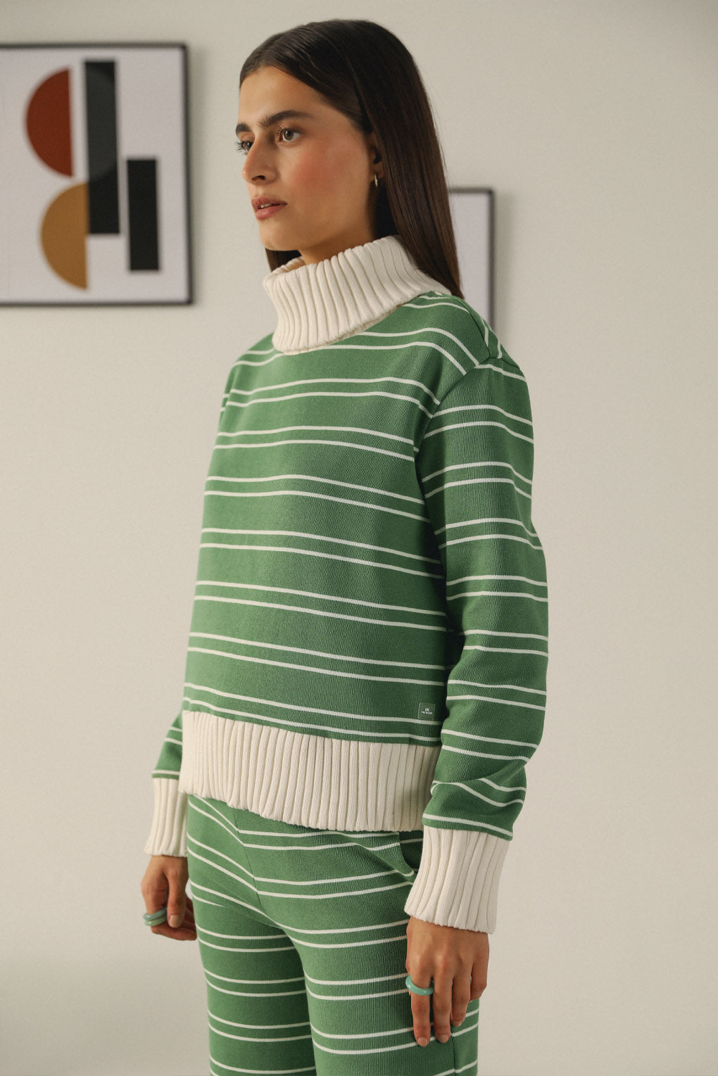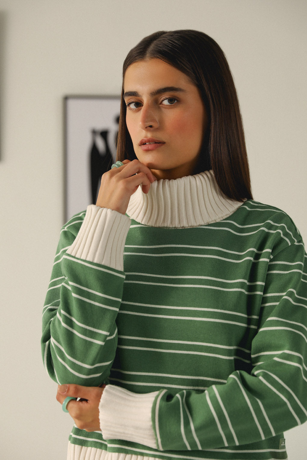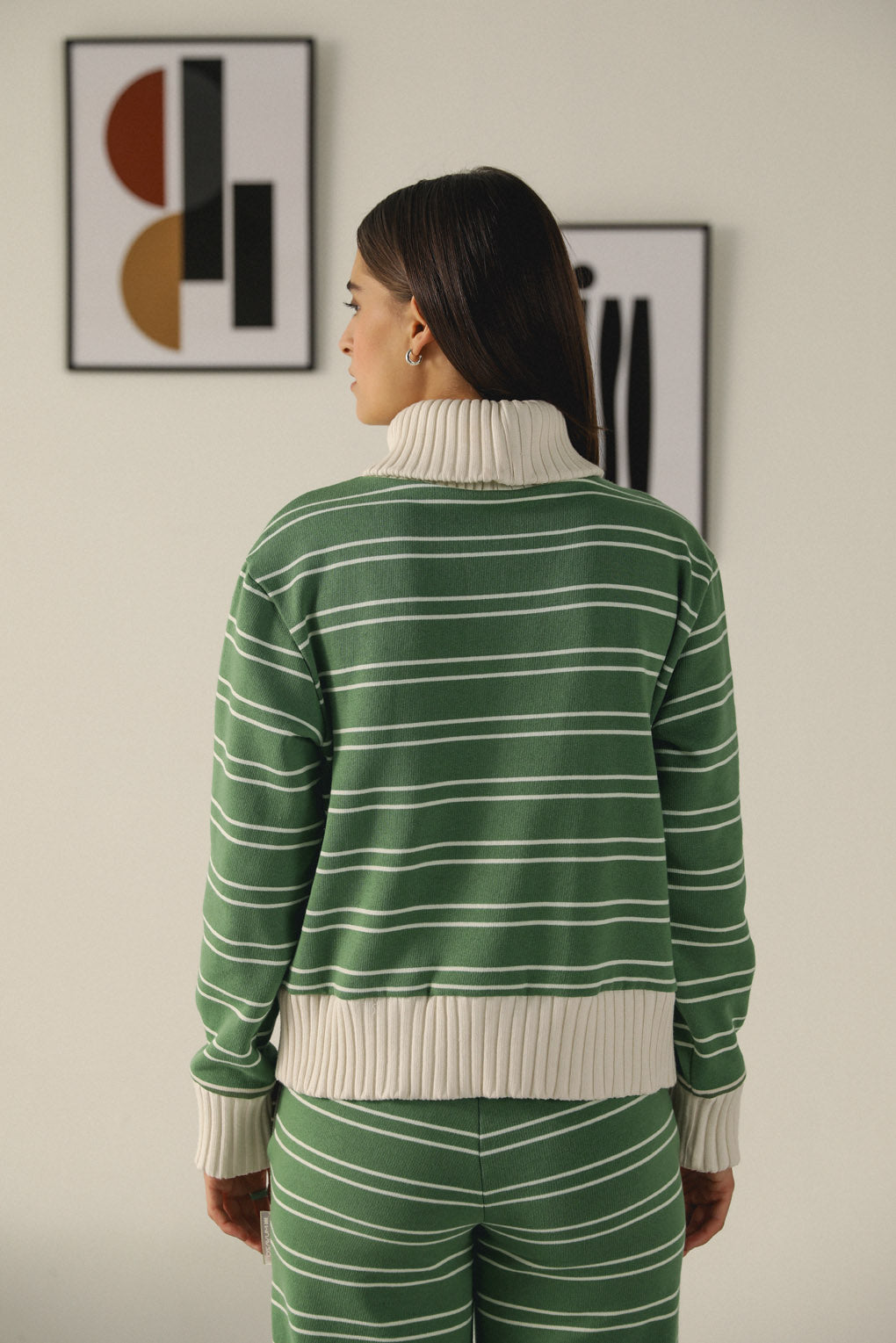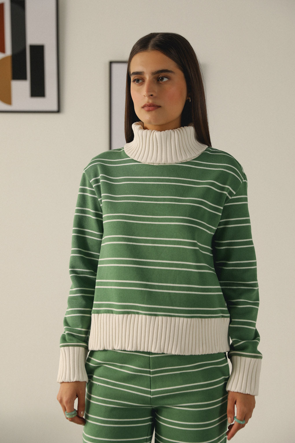 Elevate your wardrobe collection with our Snuggle Ease Top, designed for ultimate comfort and chic style. Crafted from soft yarn-dyed stripe fleece, this sweat top combines warmth and a trendy aesthetic, making it an essential piece for your casual wardrobe. The standout feature is the heavy rib high neck, providing extra coziness and warmth during cooler days. The unique yarn-dyed stripes create a dynamic visual texture that adds depth and interest to the classic silhouette.