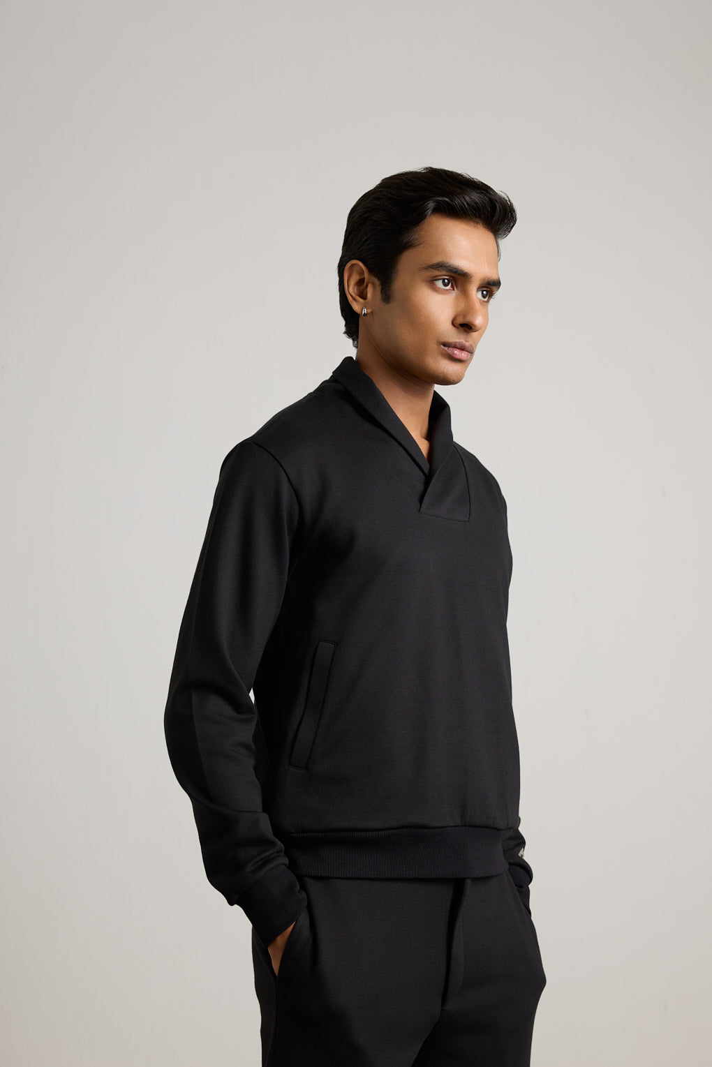 Elevate your casual wardrobe with the Noir Luxe Sweatshirt, designed to combine comfort with distinctive style. Crafted from high-quality poly ponte fabric, this sweatshirt offers a soft, smooth feel and a structured yet cozy fit. The standout overlapping collar detail adds a modern, sophisticated touch to the classic sweatshirt design, enhancing both its visual appeal and refined look. Ideal for casual and semi-formal settings, the Noir Luxe Sweatshirt is perfect for those who appreciate a blend of comfort and elegance. Whether you're relaxing at home or heading out, this sweatshirt ensures you stay stylish and comfortable.