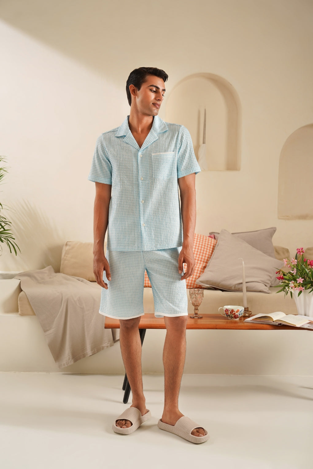 Drift into comfort with these Spruce Blue Shorts. Made from breathable, ultra-soft cotton, they offer a relaxed fit and elastic waistband for easy movement. The soothing sky blue gingham pattern with white piping adds a touch of refinement. Perfect for warm nights or cozy lounging, these shorts combine classic style with ultimate relaxation for your night time routine.