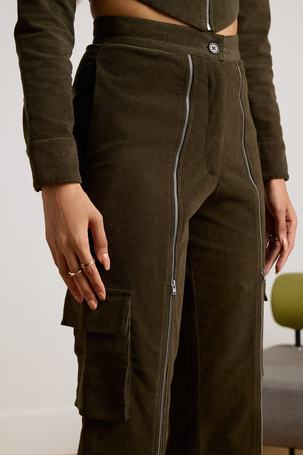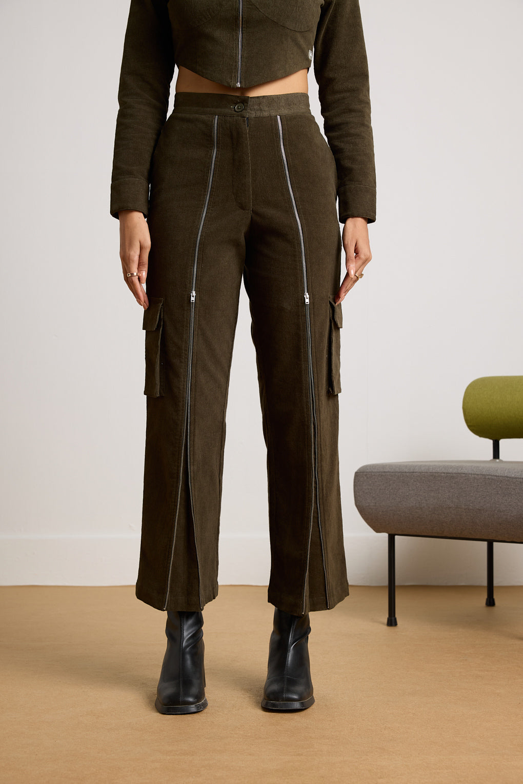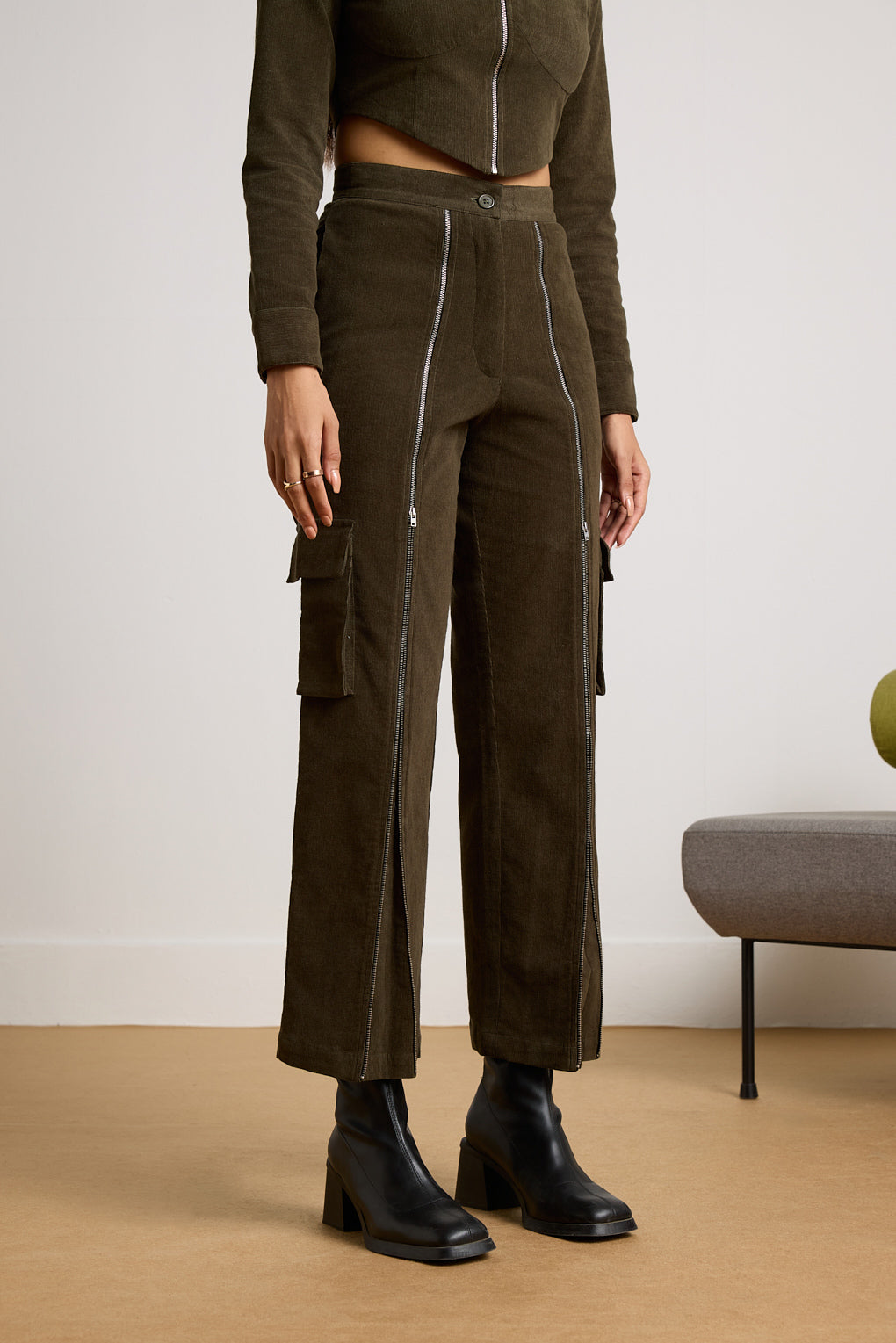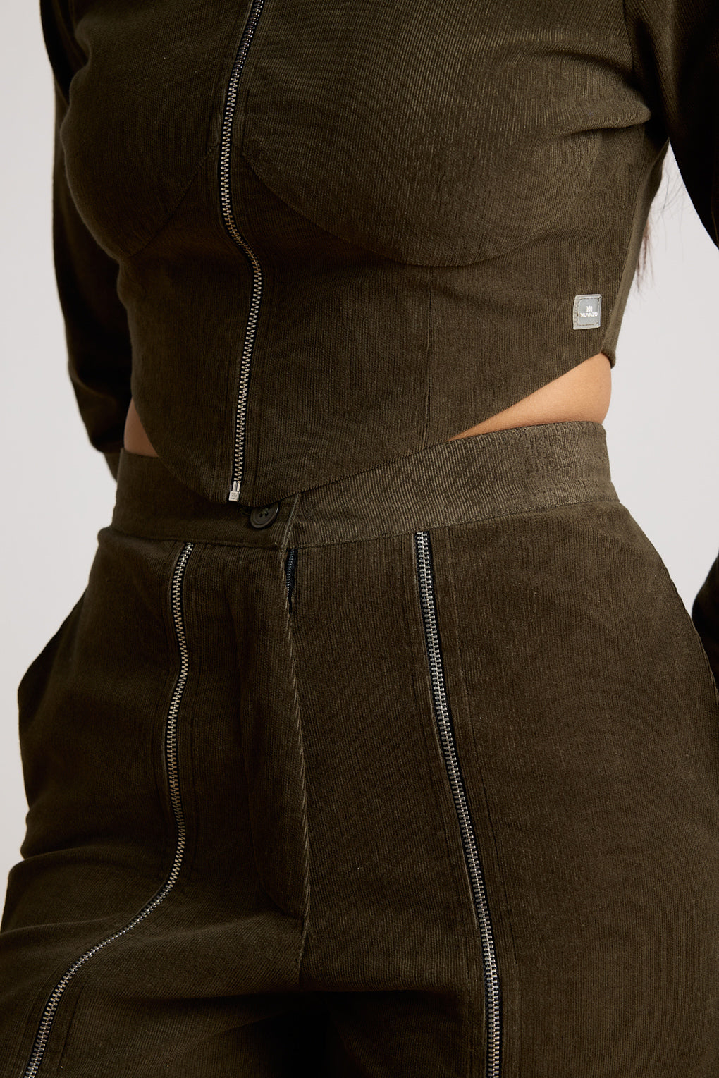 Redefine sophistication with the stylish Timberline Zipper Co-ord Set, featuring a chic corset top and modern corduroy pants. The corset top is crafted from luxurious corduroy, with a sleek front zipper for adjustable styling and elegant cuffed sleeves. The matching pants, made from premium corduroy, feature bold full-length zippers along the front legs, adding a contemporary edge and versatile styling options. Together, this co-ord set delivers a cohesive, fashion-forward look that seamlessly transitions from day to night. Perfect for making a statement, this set blends classic textures with modern design elements for an effortlessly polished ensemble.