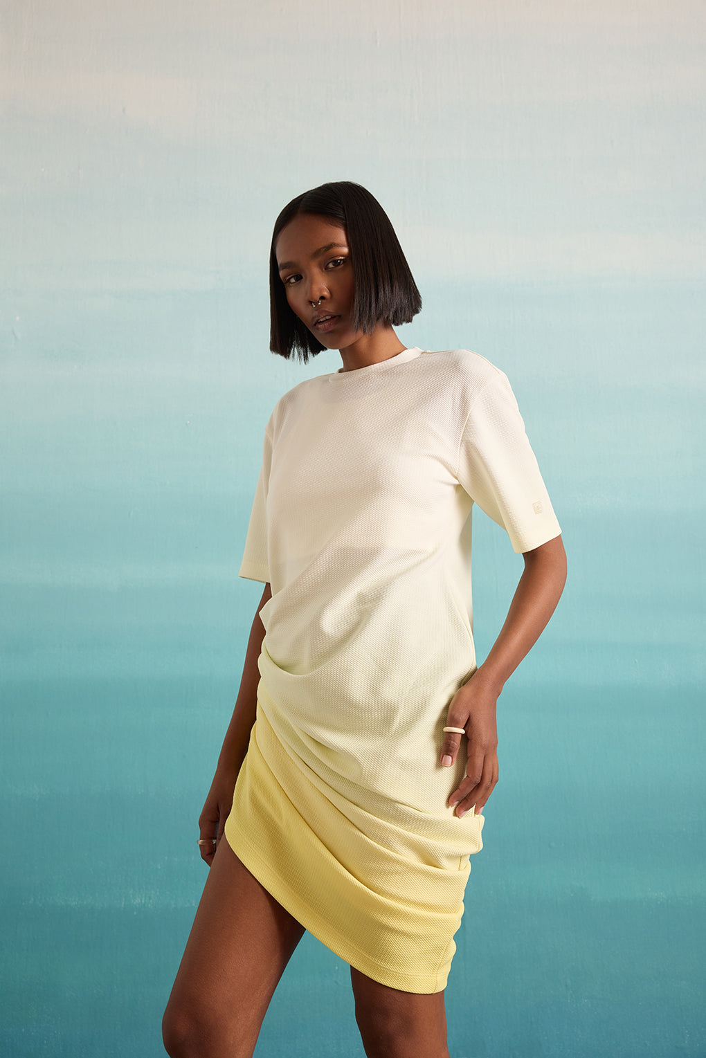 Introducing the Sunlit Serenade Dress, an embodiment of elegance and sophistication. This exquisite piece features a captivating ombre print that seamlessly transitions hues, designed to draw the eye and make a lasting impression. Its gracefully draped silhouette ensures a flattering fit, effortlessly accentuating natural curves while maintaining a relaxed and elegant feel. Perfect for any occasion where style and comfort are paramount, this dress promises to enhance your wardrobe with its unique charm and refined aesthetic.