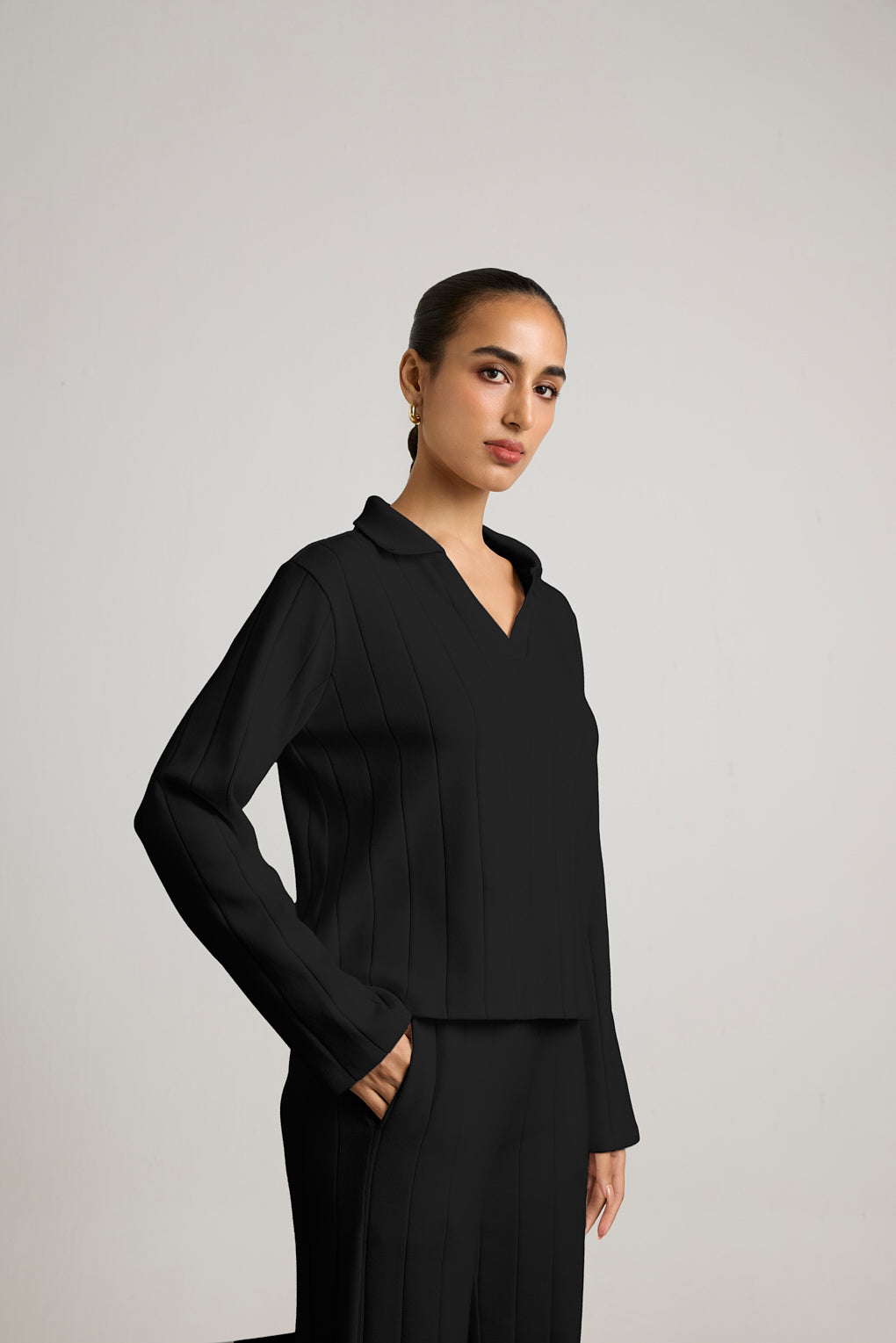 Upgrade your essentials with the Tactile Pleated Top, crafted from soft variegated ribbed fabric that adds texture and dimension to your wardrobe. Featuring a sleek collar and V-neck detail, this versatile top effortlessly combines casual comfort with sophisticated style. Designed for a close fit, it accentuates your shape while providing flexibility and ease of movement. The ribbed fabric ensures a snug yet comfortable fit.
