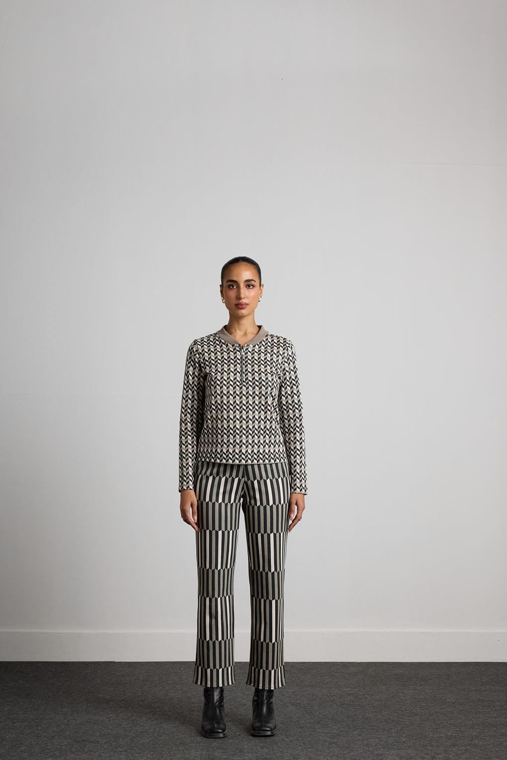 Elevate your style with the Artful Geometry Ensemble. The top features a refined small geometric print, offering a subtle yet sophisticated pattern that exudes modern elegance. Paired with matching straight-leg pants adorned with a bold, larger geometric print, this set creates a striking contrast of intricate patterns and eye-catching visuals. Crafted from high-quality fabric for both comfort and durability, this co-ord set ensures a flattering fit and effortless wear. Whether accessorised minimally or worn as a statement look, this ensemble is perfect for those who love a coordinated style that radiates confidence and contemporary flair.