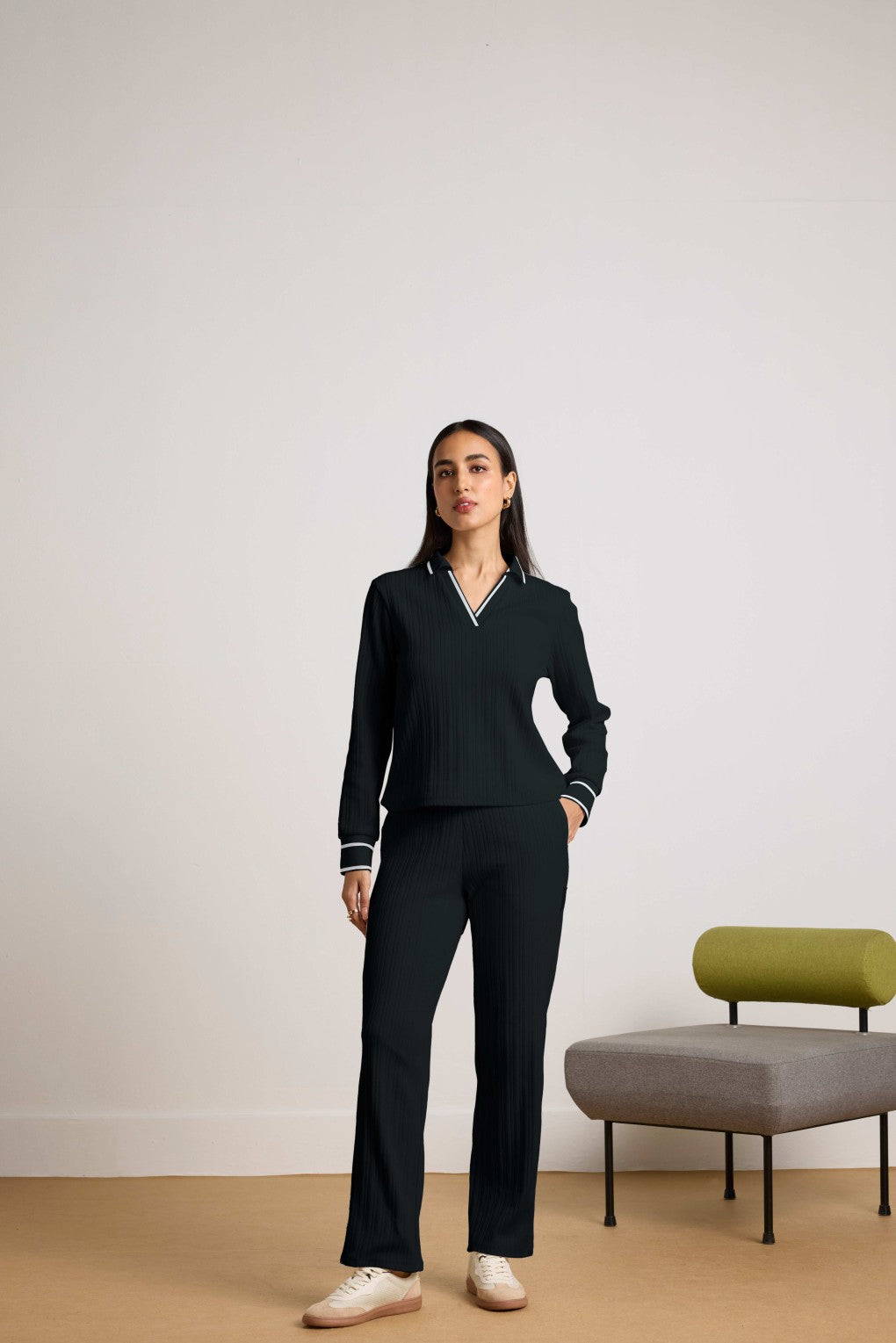 Elevate your everyday style with the chic women’s Warmth Weave Co-ord Set, crafted from variegated ribbed fabric that features a distinctive texture with subtle color variations for added sophistication. The contrast stripe collar and cuff details give the top a contemporary look, blending sporty and elegant elements. Paired with straight pants that feature a matching ribbed stripe waistband, this set offers a seamless, polished appearance. Made from soft, high-quality fabric, the pants ensure a comfortable and flattering fit. Perfect for lounging or casual outings, this versatile co-ord set effortlessly combines style and coziness.