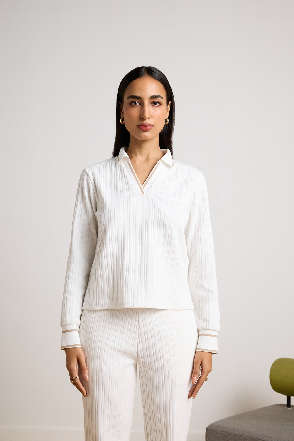 Elevate your casual wardrobe with the Warmth Weave Top, featuring a unique ribbed texture with subtle colour variations that enhance its visual appeal. The contrast stripe collar and cuff details add a contemporary touch, giving it a chic, sporty finish. Designed for both comfort and style, this top is perfect for layering or wearing on its own. Whether you're lounging at home or heading out for a casual outing, this cozy top blends modern design with comfort, making it a versatile addition to your wardrobe.